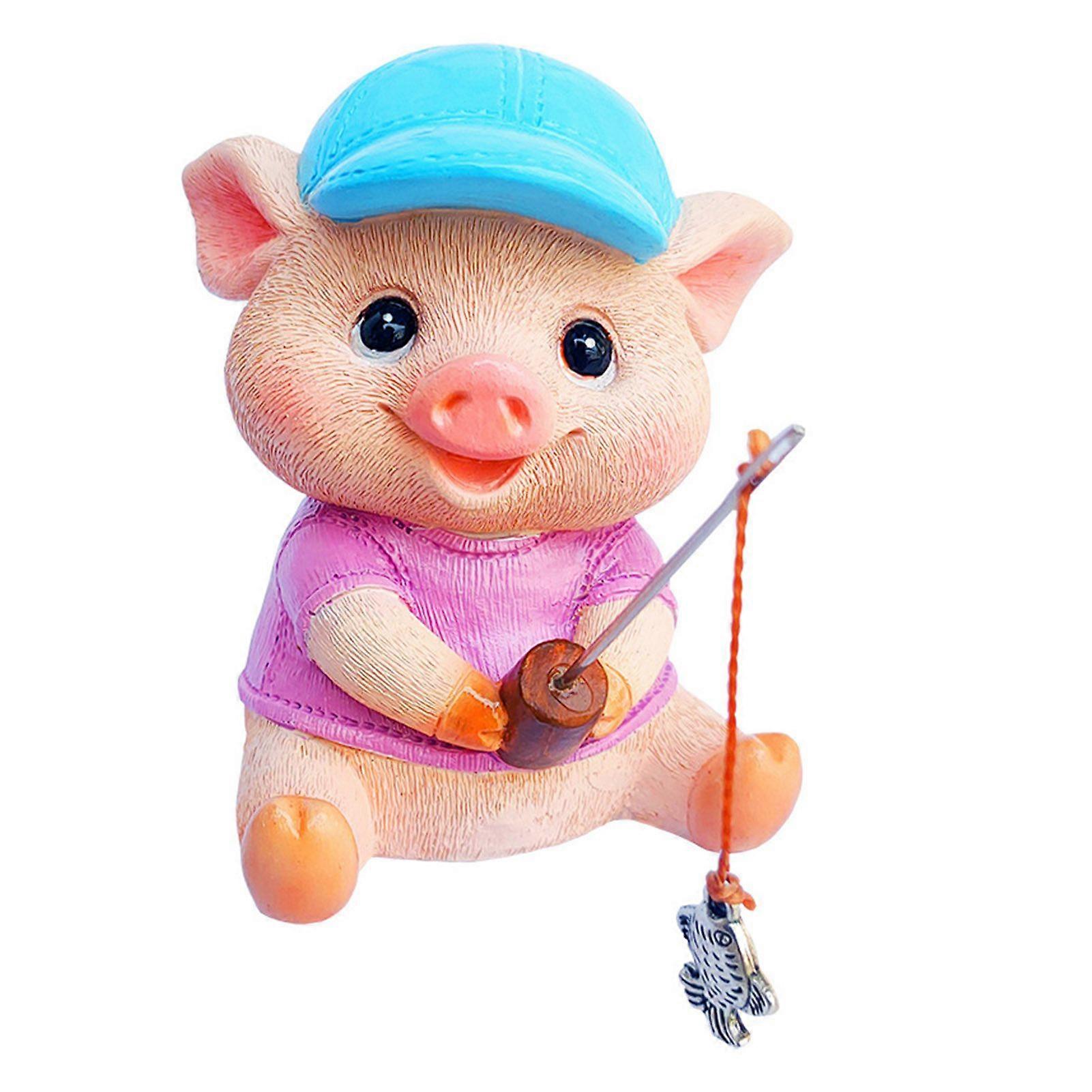 Fishing Pig Figurine Resin Mini Piglet Statue Cartoon Fisherman Pig Sculpture for Water Feature Garden Patio Pond Decor