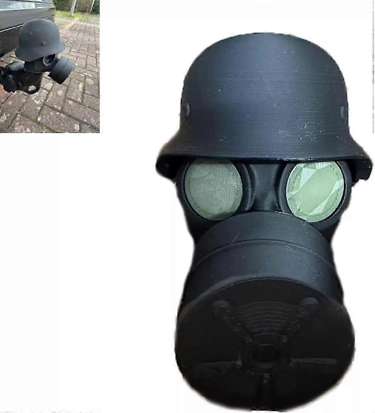 Cap with helmet and mask with desired eye colour May include: A black mask attached to a black helmet. The helmet has a round shape with a brim and is connected to the mask with a black fabric over the connection. A round filter is attached to the front of the mask Here you can stand out from the crowd and create your own style. This cover shows a cap with steel helmet and mask Cover cap trailer hitch with steel helmet and mask Brigade helmet neon green The gas filter is screwed onto the cap and also serves as an anti-theft device. The gas filter has a threaded screw that protrudes from under the ball in the cap and holds the cap in place. Package included: 1 * Cover Cap Notes: Due to the different monitor and light effect, the actual color of the item might be slightly different from the color showed on the pictures. Note: Due to the light and screen setting difference, the item's color may be slightly different from the pictures. Please allow slight dimension difference due to different manual measurement.