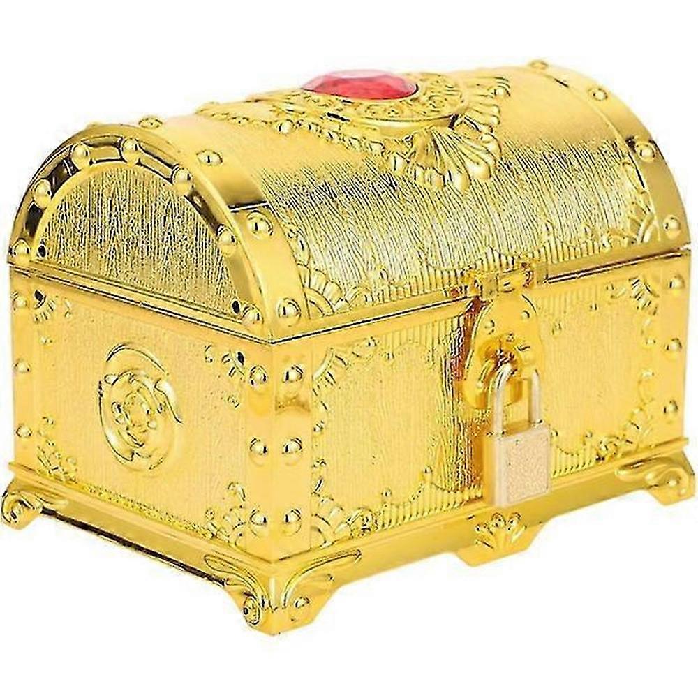 Antique Golden Pirate Treasure Chest with Lock and Key, Vintage Toy Storage Box