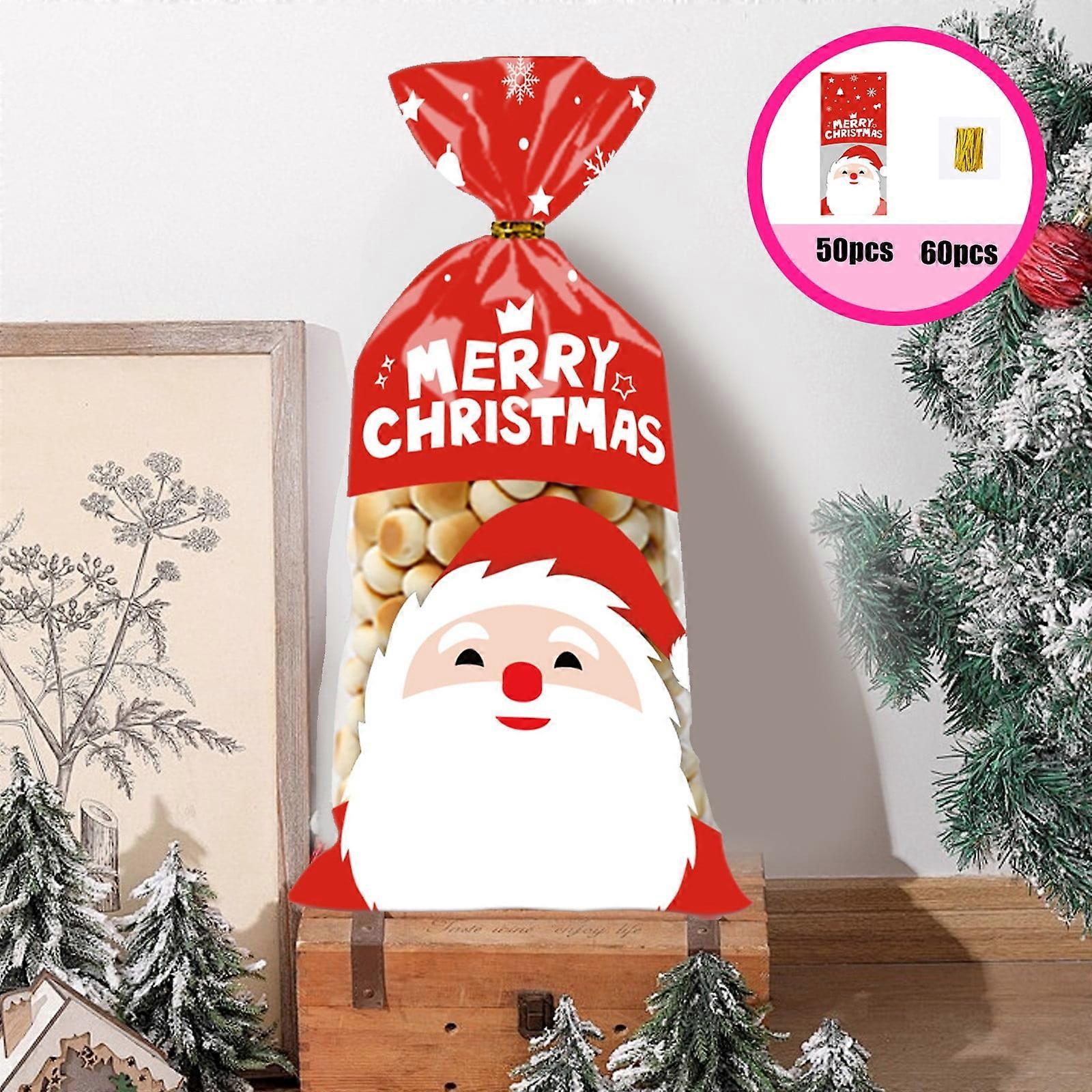 Christmas Cellophane Treat Bags, 50Pcs Xmas Clear Cello Gift Bags Candy Goodies Bags with Twist Ties for Christmas Party Supplies (White)