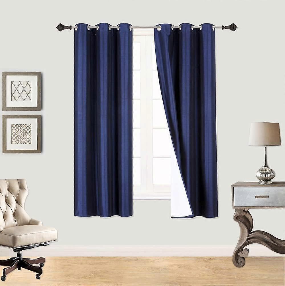 2 Pc Faux Silk Blackout Curtains w/ Silver Grommets, Room Darkening, Energy Efficient, Noa Size 63" 84" 95" 108", Dark Blue, 63" Short