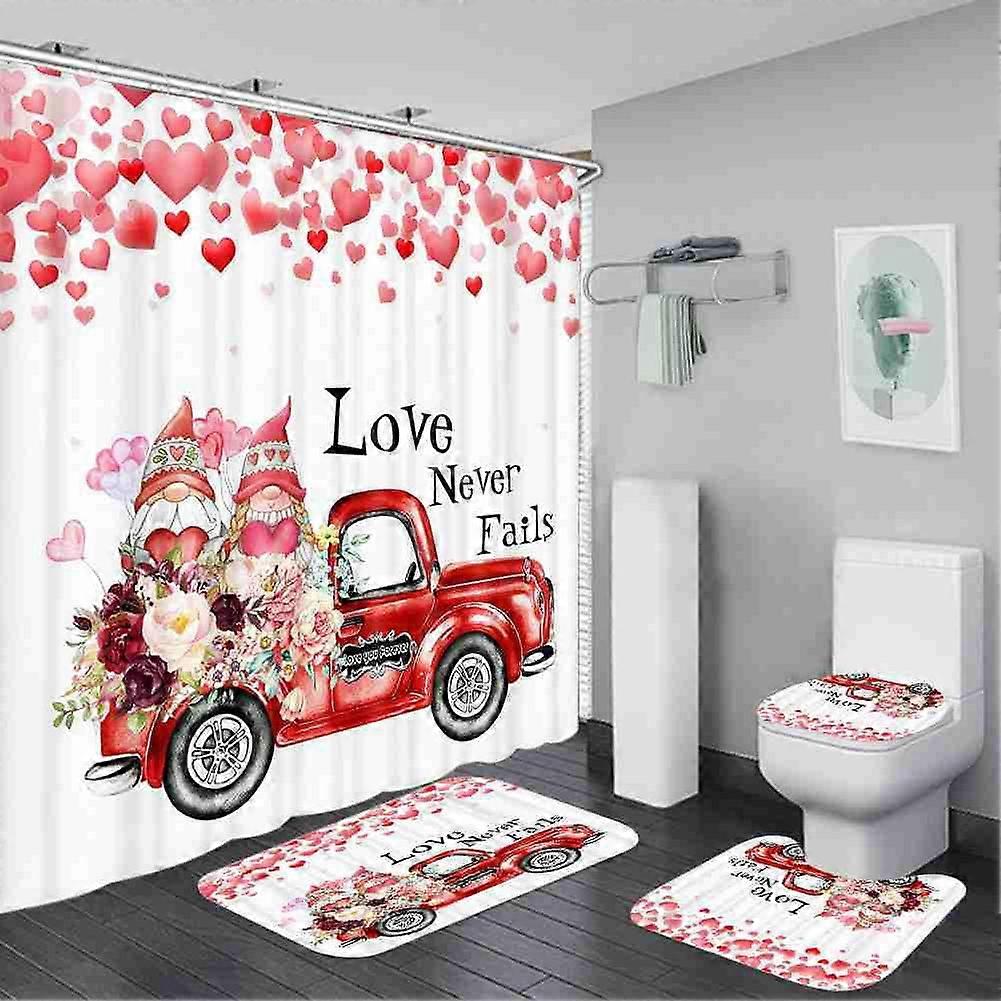4-Pc Valentine's Shower Curtain Set w/ Non-Slip Rugs, Toilet Cover & Bath Mat, U-Shaped, Red Truck Design, 12 Hooks, Compatible with Standard Showers