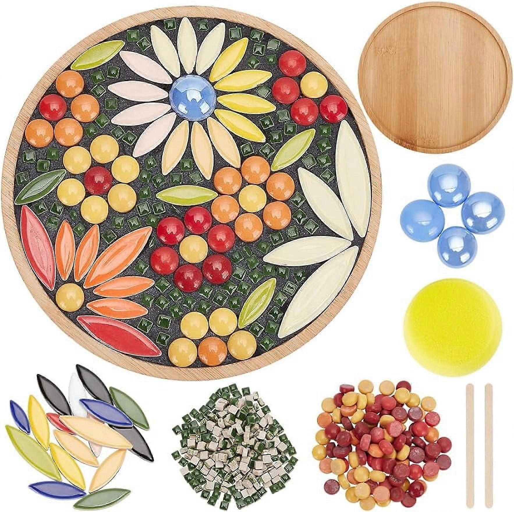 DIY Mosaic Craft Kit Flower Mosaic Bamboo Coasters, Mixed Color Glass Tiles with Round Base, Compatible with Handmade Home Decor, 6.1"
