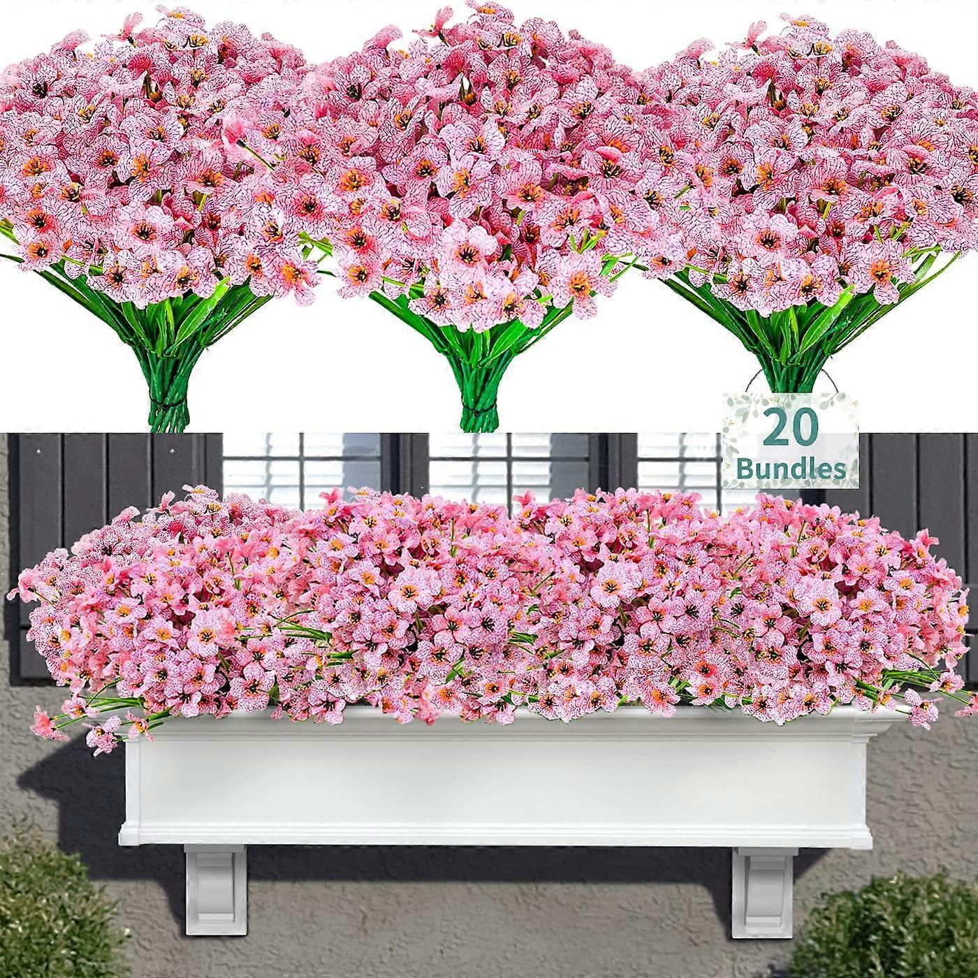 20 Bundles Artificial Flowers for Outdoor Decoration, Plastic Greenery Shrubs, UV Resistant Faux Plants with Pink Blooms, Compatible with Home Garden