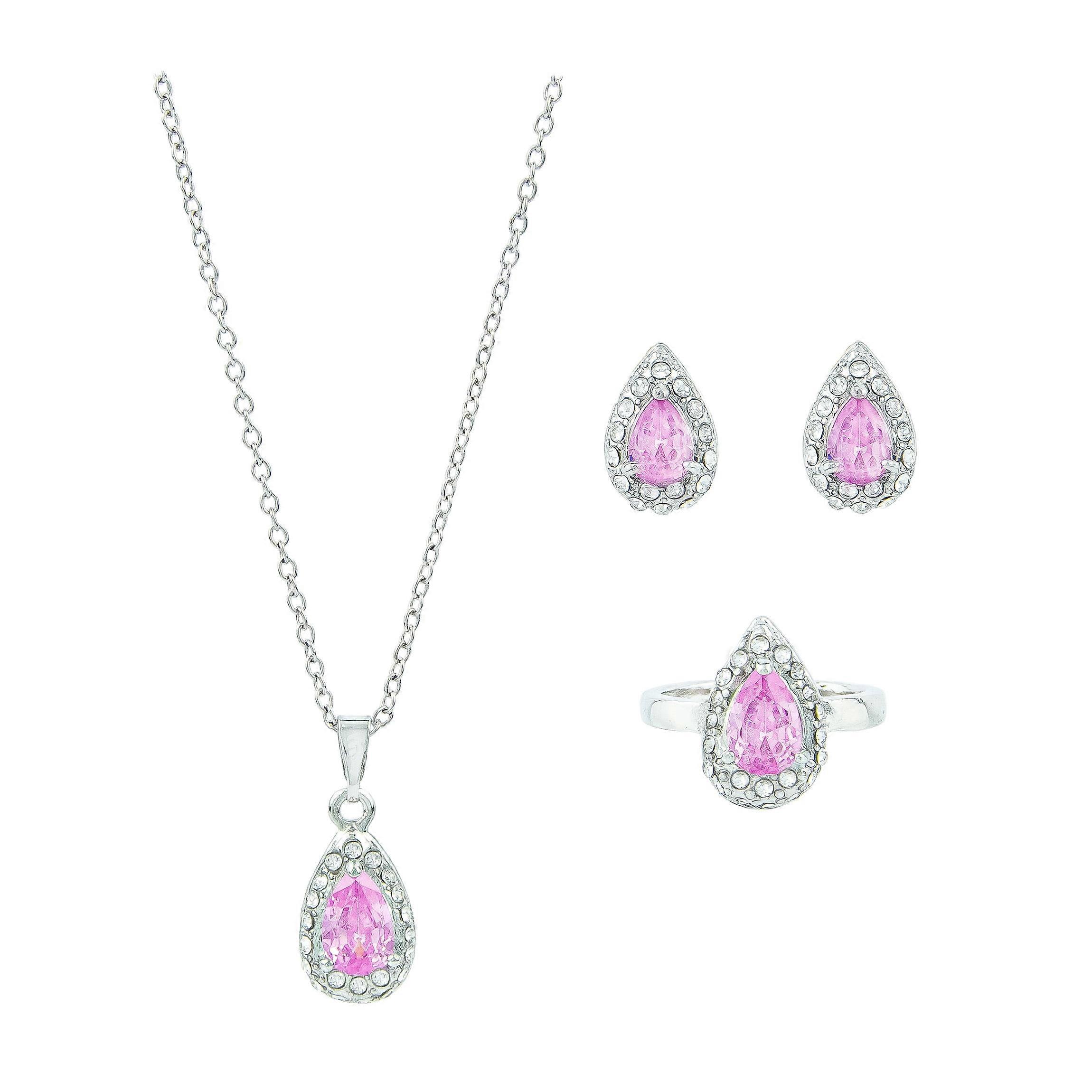 Pretty In Pink Teardrop Simulated Sapphire Pendant, Earrings and Ring Set Size 6