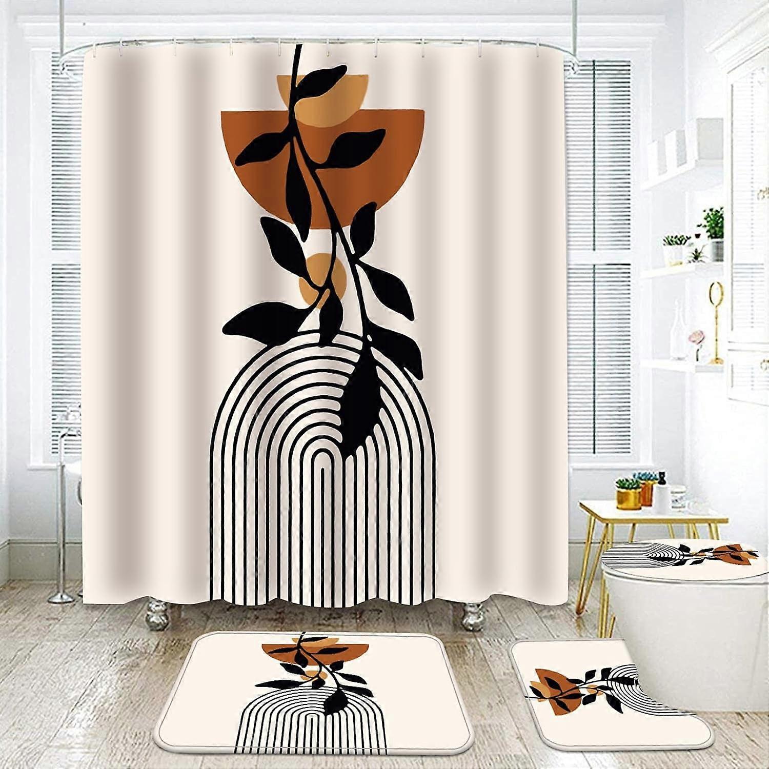 NEWSUYAA Mid Century Shower Curtain Set, Modern Geometric & Leaves Design, 4pc Bathroom Set with Rugs, Mat, Toilet Cover & Hooks, Boho Home Decor