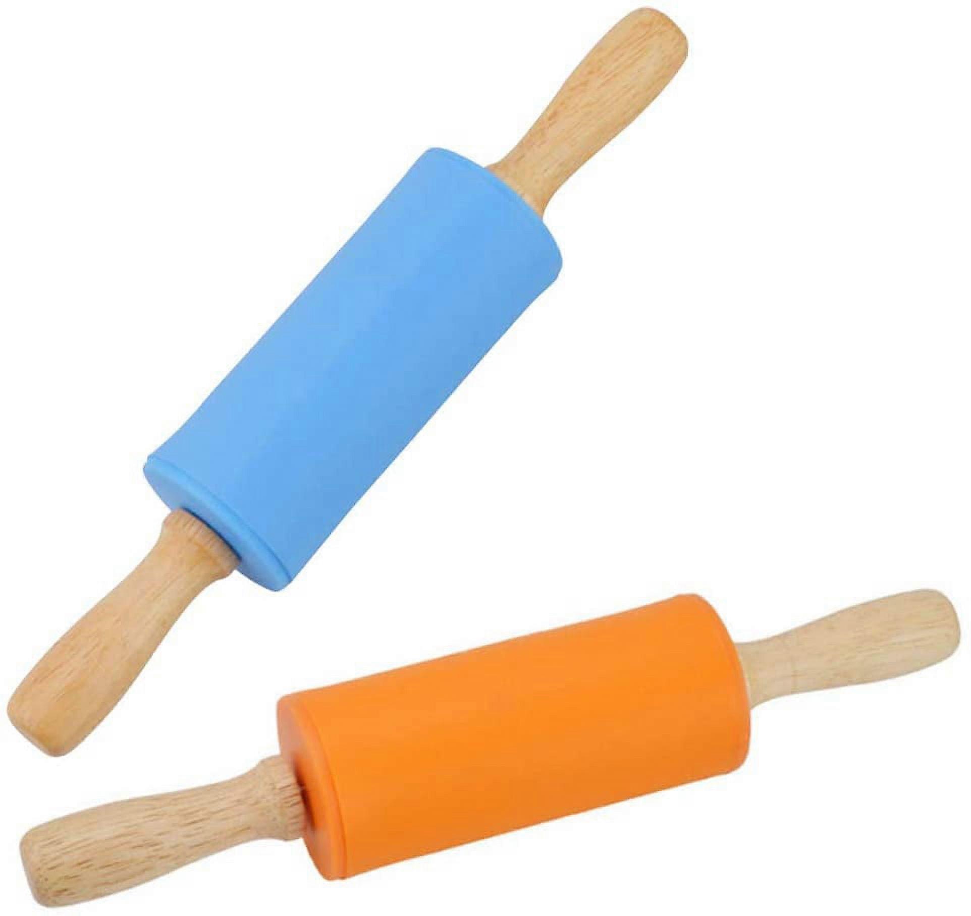 POWKOL 2 Pack Mini Rolling Pin for Kids, 9 Inch Wooden Handle Rolling Pin Non-Stick Silicone Rolling Pins for Children Cake Baking(blue,Orange)