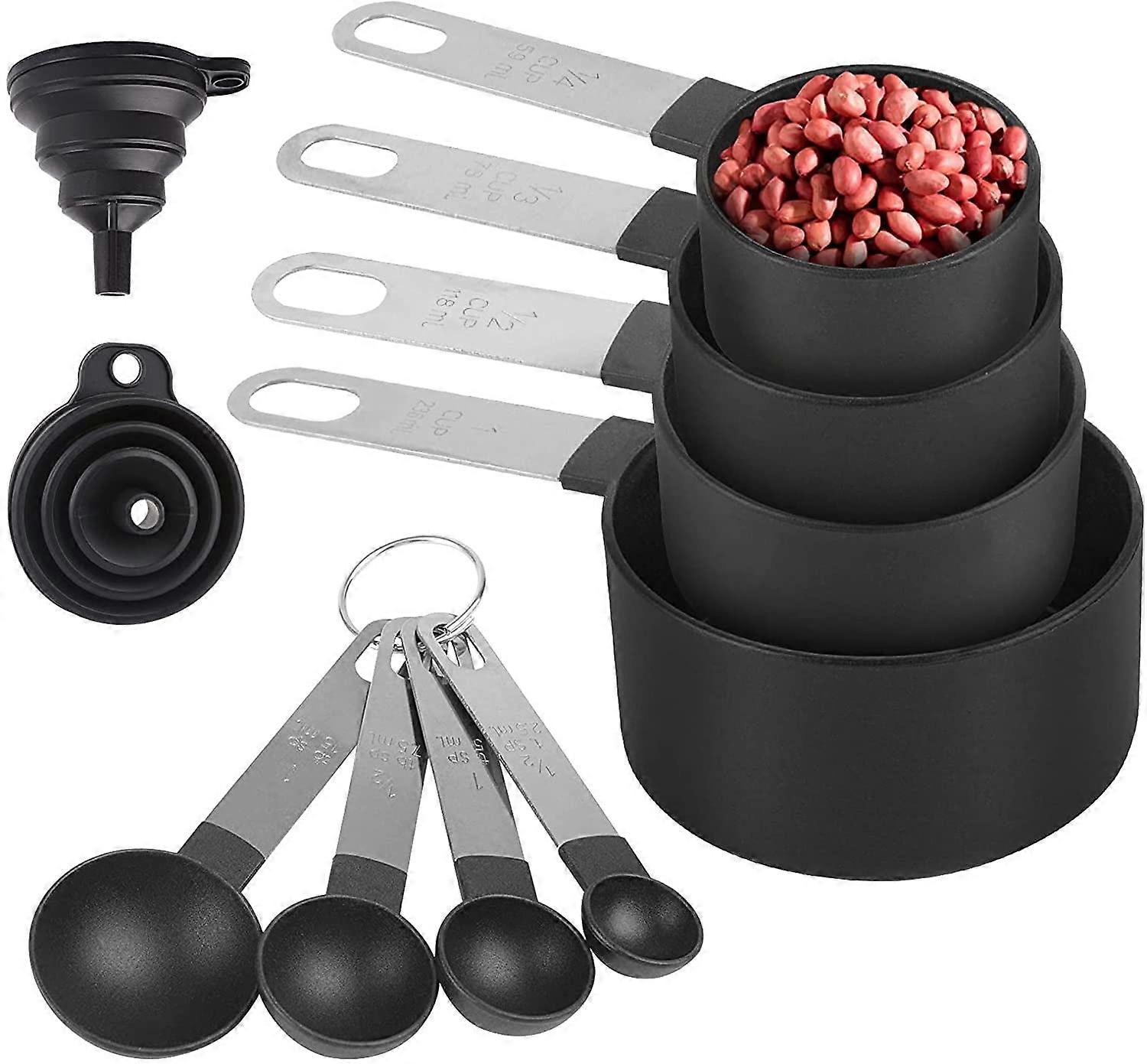 8Pcs Measuring Cups & Spoons Set with Stainless Steel Handle, Silicone Collapsible Funnel for Dry/Liquid Ingredients (Black)