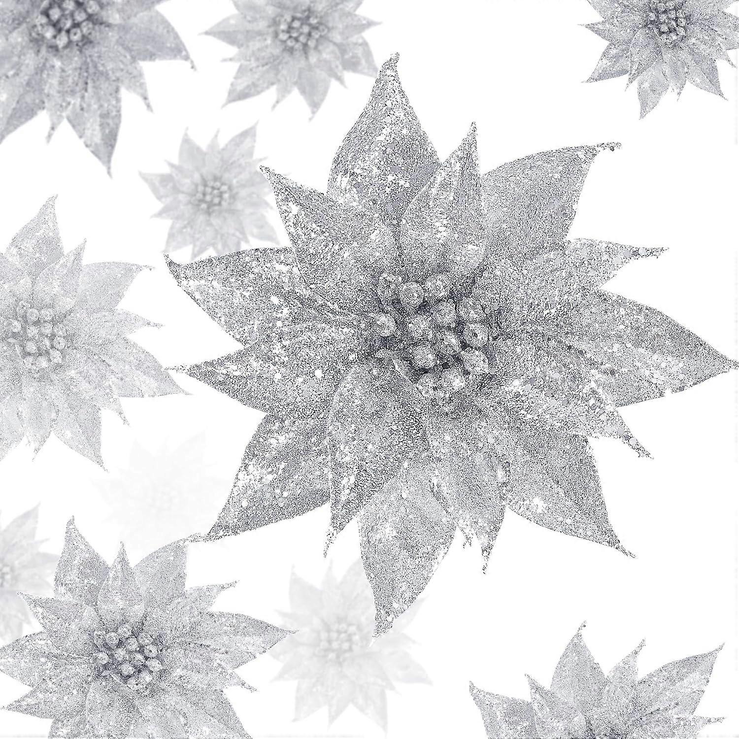 15 Pcs Christmas Glitter Flowers Ornaments, Shining Artificial Poinsettia with Clips for Tree, Wreath, Holiday Decor (White)