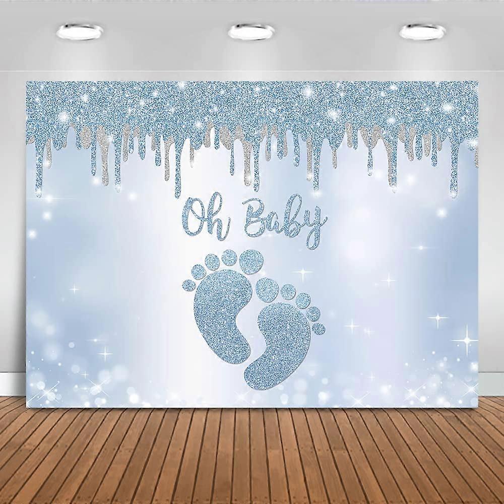 Blue Silver Oh baby backdrop little feet baby shower background for boy footprint baby shower party decorations banner photo booth backdrops (7x5ft)