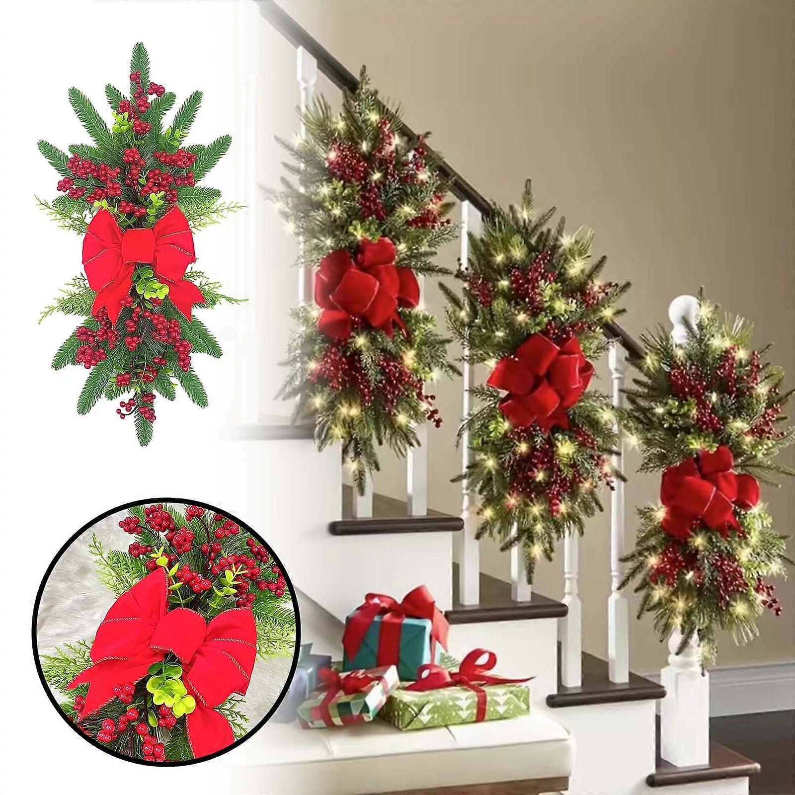 Hanging Ornaments Christmas Teardrop Prelit Xmas Stair with Red Bow Berries and for Door Staircase Garland Pendant Hanging Decoration 22.8 Inch