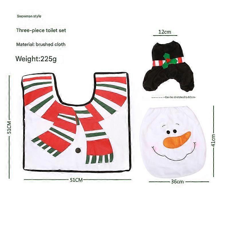 Add a festive touch to your bathroom with our 3 piece toilet set. Made of soft velvet , this set comes with a tank , seat , and tissue box . Perfect for gifting to well-behaved children. Easy to install and suitable for homes and hotels. Product name: Toilet Seat Weight: 156g Style: Santa Claus style : non-woven fabric + short plush velvet cloth Scope of application: Suitable for bathroom decorations in shopping malls, supermarkets, hotels, stores, homes and other places Package List: 1* Toilet Seat 1 *Toilet Water Tank Notes: Due to the lighting effects and camera angles, the color of the item and that shown in the picture might have a nuance. Due to manual measurement, there might be a tolerance in the product size. [Product content] 3 sets of Christmas bathroom sets. 1*carpet, 1*toilet seat sleeve, 1*water tank cover, paper towel box. In addition to decorating your bathroom, this toilet lid suit can also be perfectly matched with other Christmas decorations, adding Christmas holidays to your entire family. [Anti -slip and easy to clean] We choose the back of the floor pad to use non -slip particles, which can effectively provide non -slip effects. Easy -to -clean materials can easily remove dirt and stains, and keep the toilet seat refreshing and brand new. [Excellent gift] Add joy and festive atmosphere to the bathroom of loved ones and friends. This practical gift will keep the toilet seat warm in the cold season, saving your friends time and energy. The most important thing is that through this Christmas bathroom decorative set gift, you can convey warm Christmas blessings and make your loved ones and friends feel special and caring. [Easy to install and disassemble] There is no extra tool, and the opening design has a loose band, allowing you to easily install our toilet sleeve on the toilet. Whether it is round or oval toilet, it can be easily installed. [Perfect Christmas decoration] Christmas toilet lid is a small detail, which increases the Christmas spirit in the family. For the toilet design with a classic Christmas atmosphere image, our Christmas toilet lid is decorated with cute Christmas elements, such as Santa Claus, Snowman and Christmas tree, adding a strong Christmas atmosphere to your bathroom.
