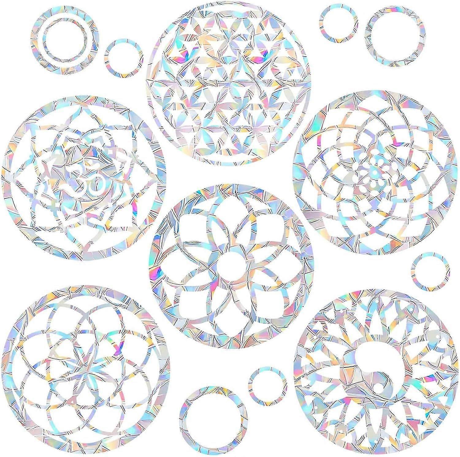 Quality and Refund Guarantee- Our plastic wrap is made of high-quality prism film, which is thicker and more colorful. We provide long customer service for 6 months without worrying about shopping. Sun Catcher Stickers They reflect sunlight and create a beautiful rainbow in your room. Capture sunlight and turn it into a bright rainbow throughout the room. Sizes range from 0.8 "to 3.6".Reusable and cleanable These decals are electrostatic adherent. If you need to clean a window, you can remove it and reinstall it after cleaning. These attachments can also be cleaned with water.18MandalaWindow Stickers The package contains 18 Mandala window stickers. These window decals can be used as a bird deterrent and beautiful home decor.Anti-bird Collision window Anti-bird collision window decals can alert birds and prevent birds from striking Windows. So it protects wild birds from glass collisions. It can be applied to Windows and glass doors in homes and offices