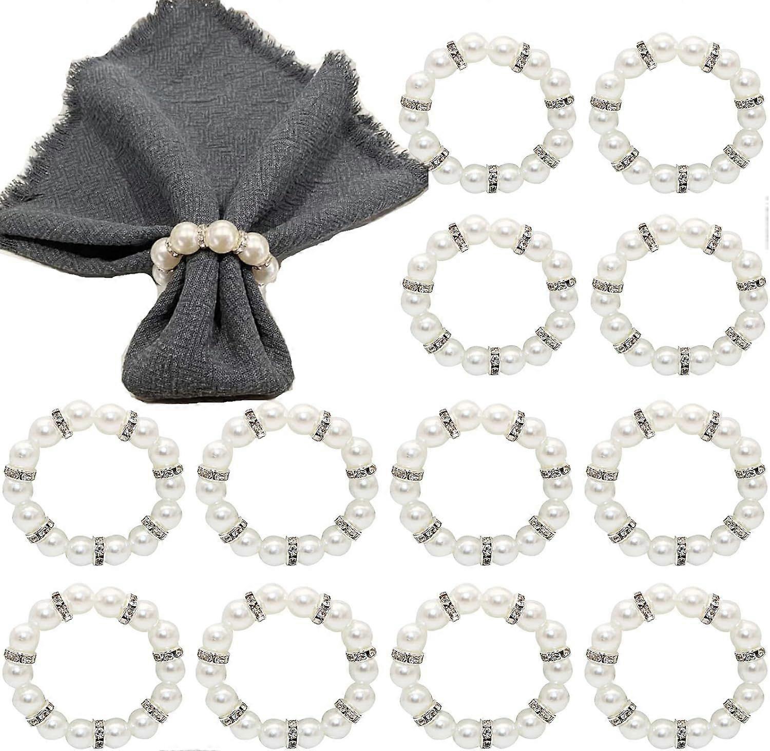 12 PCS Pearl Silver Napkin Ring Holder, Rhinestone Serviette Rings Buckle Spring Beaded