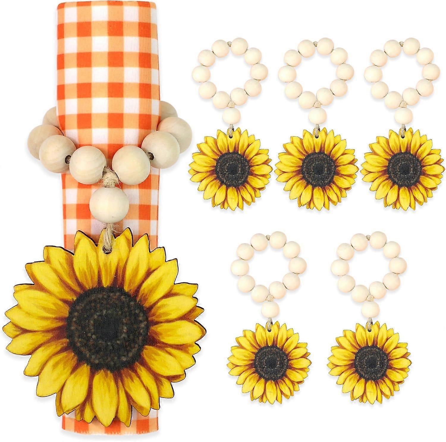 Sunflower Set of 6 Fall Farmhouse Napkin Ring Holders Wood Beads Spring Daisy