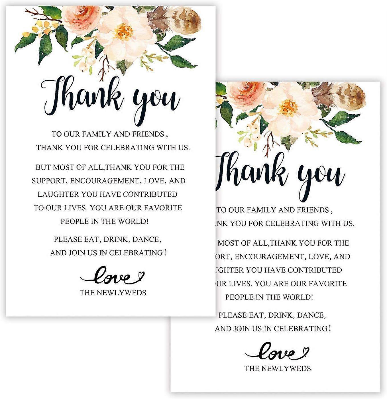 Widely Using: the new Mr and Mrs, Bride and Groom, Newlyweds Perfect addition to your wedding reception decorations or bridal shower.Impress Your Customers: 50 Floral Wedding Thank You Place Setting Cards, a thank you card at each place seating is a very thoughtful way to ensure each guest knows how appreciative you are for their attendance at your wedding or event.Material and design: these Thank You Place Setting Cards made of good quality laminated cardstock paper, durable and waterproof, cards size 4 x 6 inch and leave a great first impression when guests enter your event! is a professional brand that designs and produces cards, offering a variety of original card designs, include: birthday cards, advice cards, memorial cards, sympathy acknowledgement cards and more.High Quality Card: All cards have a beautiful glamour style, Glossy finish and premium heavy cardstock make a great gift idea and accessory for any party.