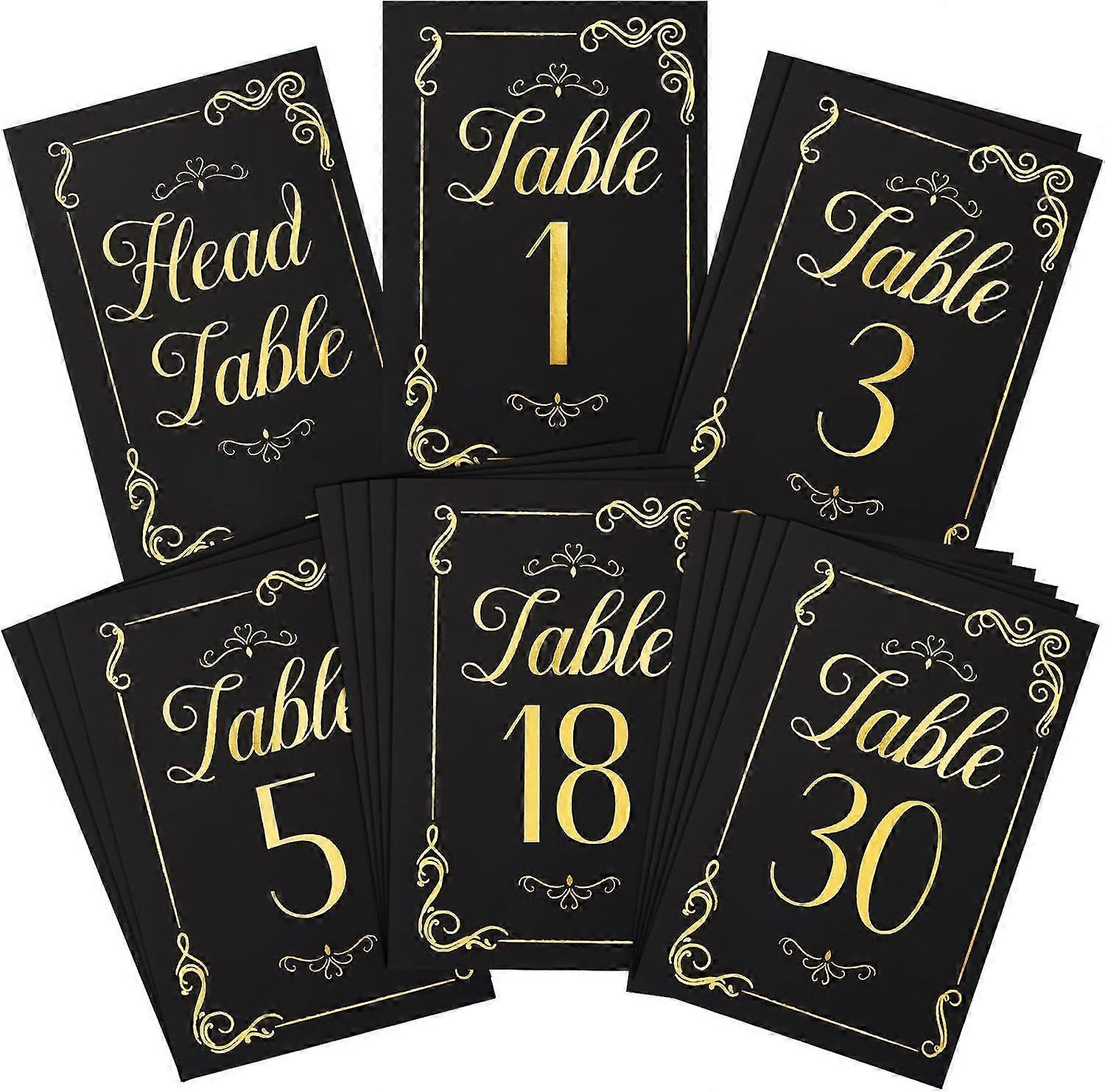 Wide Range of Applications: The set includes 31pcs wedding table number cards of 1-30 and 1 head table, ideal for table settings for weddings, birthdays, anniversaries, bridal showers, family gatherings and any other celebrations.Easy to Show: Conveniently designed and sized to fit standard stands and frames, these beautiful table number cards can be easily incorporated into wedding table decorations to create an elegant look, enhance the ambiance of your event.Double-sided Design: Each table number card measures 10x15cm/4x6in, the right size and double-sided design ensures better visibility, making it easy for guests to find their table quickly and without taking up too much table space.Premium Cardboard: Our wedding table number cards are made of high quality 350gsm cardboard, strong and sturdy. The text and pattern are foil printed, clear and vivid, will not fade, you can rest assured of long-term use.Elegant Design: The black table number cards emphasize nobility and elegance, perfect for weddings, banquets and special occasions, add a touch of elaboration to your table dcor with a classic design that complements any event theme.