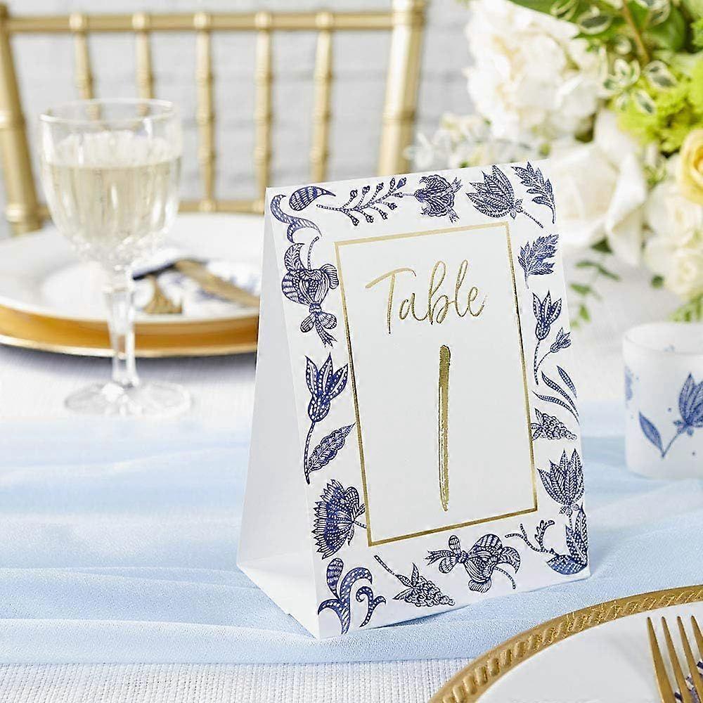 CARE FREE SET UP - Table numbers stand on their own, no additional stand necessary. Add a pop of color to your table settings and make it easier for guest to find their tableOh table number! Oh table number! Where art thou table number? There it is standing out boldly in the blues and whites of the Kate Aspen Blue Willow Wedding Table Numbers (1-25). Create a beautiful tablescape with matching dcor and party supplies from Kate Aspen's Blue Willow Collection.BLUE WILLOW - Pair with many of the other complimenting items from Kate Aspen's Blue Willow collection for a classic and elegent wedding, bridal shower or baby shower theme!BEAUTIFUL & FUNCTIONAL - Blue Willow Wedding Table Numbers have an arrangement of blue motifs around the outer edge with an inner gold foil border and gold foil lettering.MEASUREMENTS - Each cardstock table number measures 5" w x 7" h. Sold in sets of 25. Numbers 1-25 included. The table numbers are packaged in a cellophane bag.