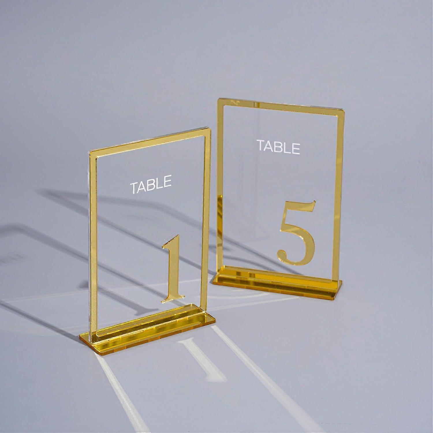 Functional Elegance: Display these beautiful gold table numbers proudly in conjunction with your seating chart to ensure your guests find their table quickly, without confusion. These wedding table numbers will help avoid confusion during your reception and improve overall flow of your guests to their seats, all while complimenting your wedding table centerpiece.Timeless and Multi-Use: The versatile design of these acrylic table numbers allows them to be used for a variety of events and with multiple dcor styles. Use at wedding receptions, galas, anniversary parties, birthdays, in restaurants and more.Whats Included: Set of wedding table numbers 1-25, 4 x 6" with machine cut stands. *Each number has a protective film on both sides to prevent damage in shipping; this should be removed before displaying.Stable Base: the base on these gold table numbers has been designed to have 3 connection points compared to one. The bases are machine cut to ensure a tight fit and prevent wobbling.Elegant, Unique Design: Our wedding table numbers are designed using acrylic overlay. OTHER BRANDS ARE SCREENPRINTED! The numbers and border are laser cut from gold mirror acrylic and applied for a 3D effect. These are truly high quality and resemble a handmade product.