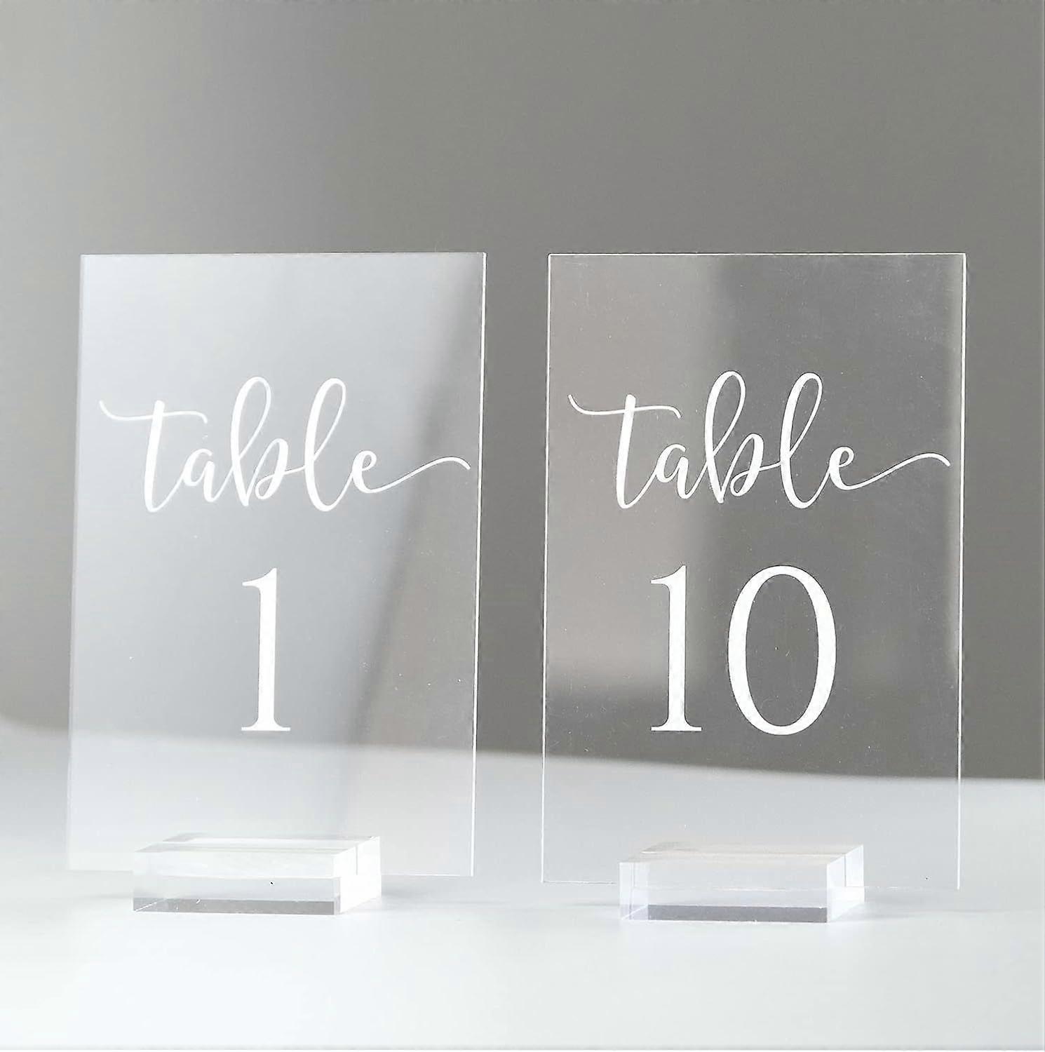 Modern& Minimalistic Style: Our specially designed acrylic wedding table numbers complete with modern style of calligraphy number are easily visible on the tables and, of course, trs chic! Not only are they purposeful in helping guests figure out where they need to sit, but they are also another really great way to add to the overall aesthetic of your wedding or event.Each Pack Includes: 10 pcs acrylic stands, 1-10 printed table numbers 4 x 6 inch.Premium Quality: Our table numbers and stand are made of high quality clear acrylic, the number on the sign adopts eco-friendly UV printing process. Both signs and stands are precision cut by laser with clean lines and polished smooth edges. Acrylic surface with a protective film, will not be easily scratched, printed fonts will not fade, can be used for a long time.Clear Acrylic Table Numbers with Acrylic Holders: Glass look acrylic is so on trend for this year's wedding decorations. These gorgeous acrylic wedding table numbers will look stunning on your tables and go with any wedding style, from rustic through to timeless and classic.Widely Used: The clear acrylic table numbers with stands are sutiable for a variety of occasions such as weddings, parties, dinners, bridal shower, baby shower, anniversaries or any other events.