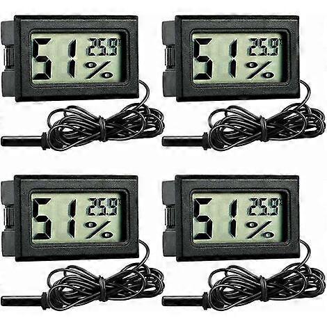 Comes with 4 thermo-hygrometers to meet different needs Integrated installation design, powered by 2 AG13/LR44 batteries (not included) Large LCD display (3.57 x 1.68 cm) with big digits for easy reading from a distance Temperature range: -50C ~ 70C, Humidity range: 10% ~ 99%, Temperature accuracy: 1C (under normal temperature), Humidity accuracy: 5% With 1.5m long probe cable, ideal for office, bedroom, living room, aquarium, incubator, brooders, reptile tank, greenhouse, etc. Number of delivered pieces: 4 Size: 48*28*15mm