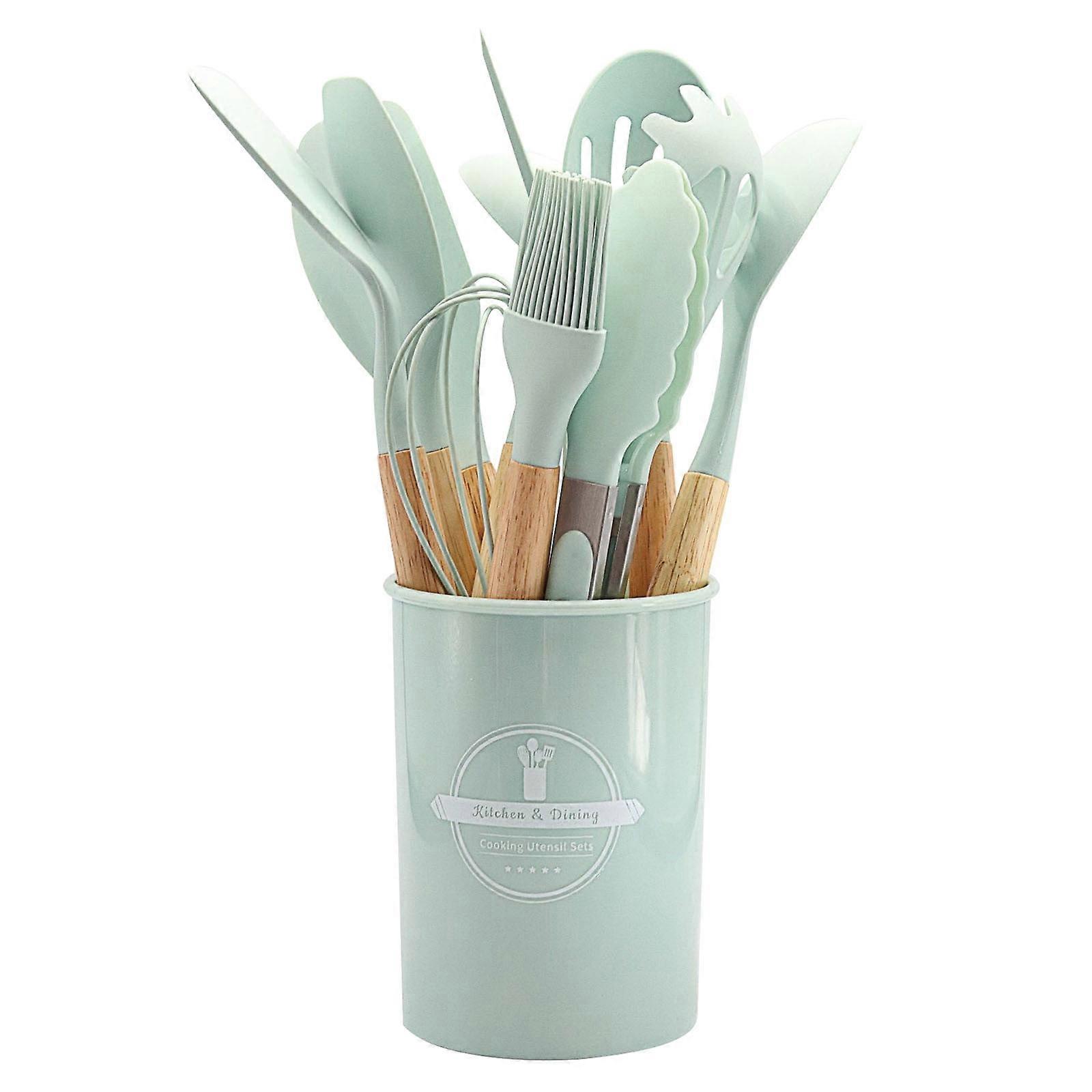 Beautynvta Silicone Kitchen Utensils with Storage Bucket and Wooden Handle, BPA Free, Kitchen Gadgets Set for Nonstick Cookware, 14Pcs, Light Blue
