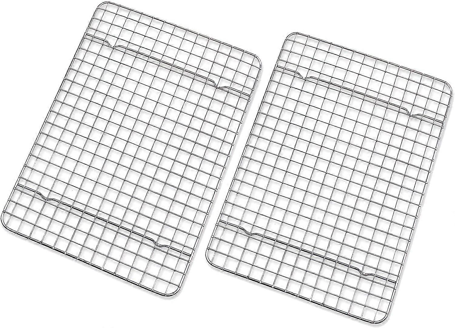 Product description Practical & Versatile Rack Versatile Rack - You can Broil, Bake, Roast, Cool or Decorate with this versatile 25*19*1.5 cm rack easily Perfect Size - The generous size allows plenty of space for cooling cakes, breads, a whole tray of cookies and more. Value Twin Pack - Comes with pack of 2 racks will give you greater convenience and saving your money Cooling or Cooking - Perfectly spaced grid pattern and 4 raised feet were specifically designed to allow optimal airflow for absolutely perfect cooking and cooling. Solid stainless steel construction and no artificial coatings making the racks safe for oven use Cooking with Ease - You can cook virtually anything from juicy roasts to non-greasy bacon or crispy chicken wings. them, baking and cooking will be a breeze by using this versatile rack! Key Features Narrow grid pattern with small square hole mesh, keeps pastries from falling through & prevents sagging Strong, heavy-duty stainless steel wire construction that can hold heavier food without buckling Raised by 6 feet providing better air circulation for even cooling & baking. Cakes, pies, meats, vegetables & more will cook more evenly in the oven 2 strong strengthening cross bars provide great support and balance, resisting warping and wobbling The edges of the rack are authentic, with no sharpness that would snag and scratch cloths, skin No harmful coatings or cheap chrome plating that can wear off or flake in your food ensuring non-toxic and food safe Can safely and easily be washed in the dishwasher without worrying about rust or corrosion Perfect Size - Each Measures 9.84*7.48 inches, designed to fit perfectly inside a standard half sheet pan and cookie sheets. Nice generous size rack for cooling cakes, cookies, pies and more Value Twin Pack - Available in a popular twin pack making it extra convenient and economical With durable solid stainless steel construction and no artificial coatings or treatments, this rack is oven-safe, dishwasher-safe, rust resistant, nontoxic and offers maximum strength & long lasting durability Perfectly spaced grid pattern optimises air circulation underneath and prevents the treats from falling through. 6 stable raised feet allow air to circulate around all sides of the pan for absolutely perfect cooking and cooling Featuring heavy duty strong wire grid, smooth no-snag edges, 6 supporting feet, and 3 strengthening cross bar to resist warping and wobbling, this versatile rack will make your baking, broiling, roasting and cooling with ease