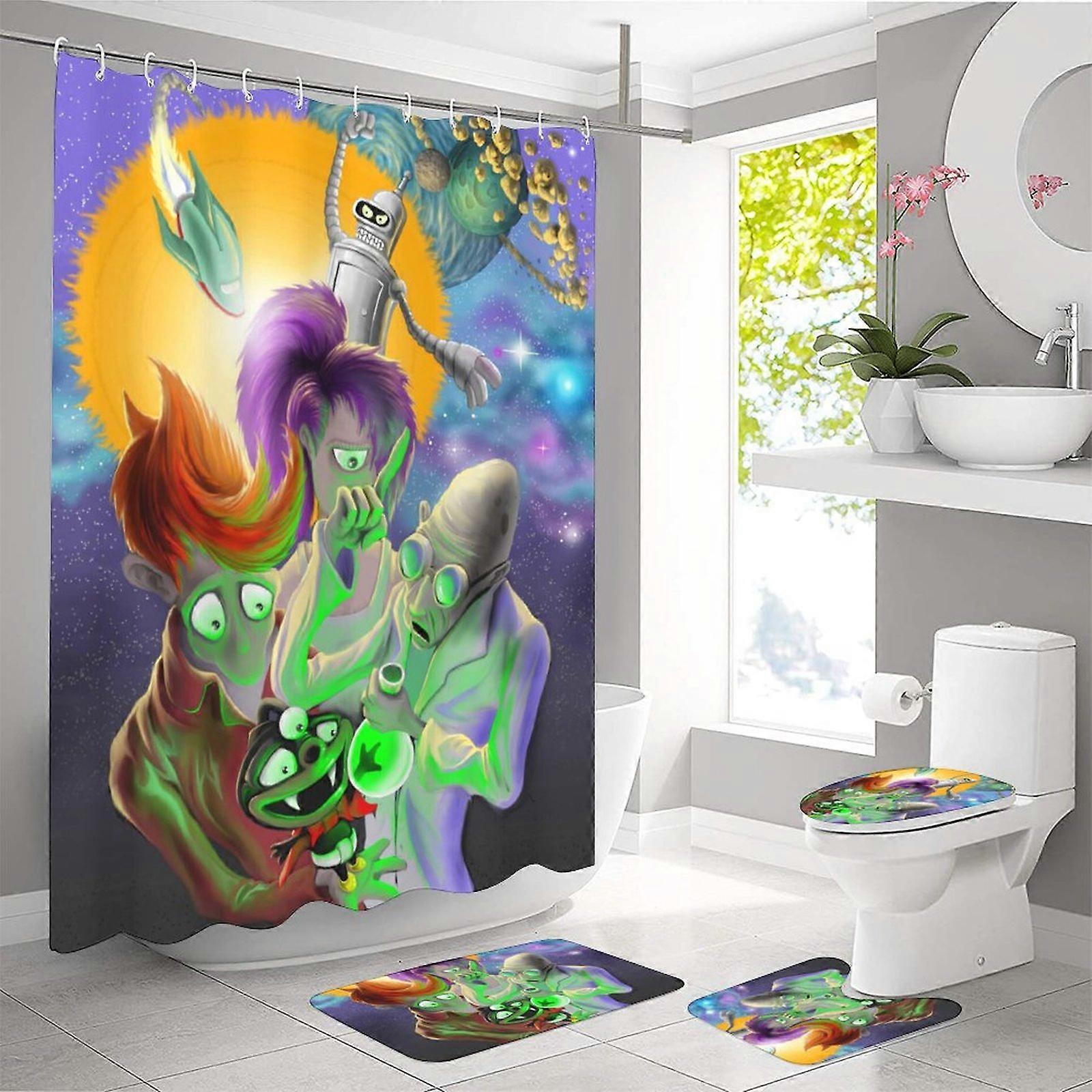 4-Piece FutuRama Shower Curtain Set with Non-Slip Rug, Toilet Cover & Bath Mat, Waterproof Curtains + 12 Hooks, 70.8"X70.8"
