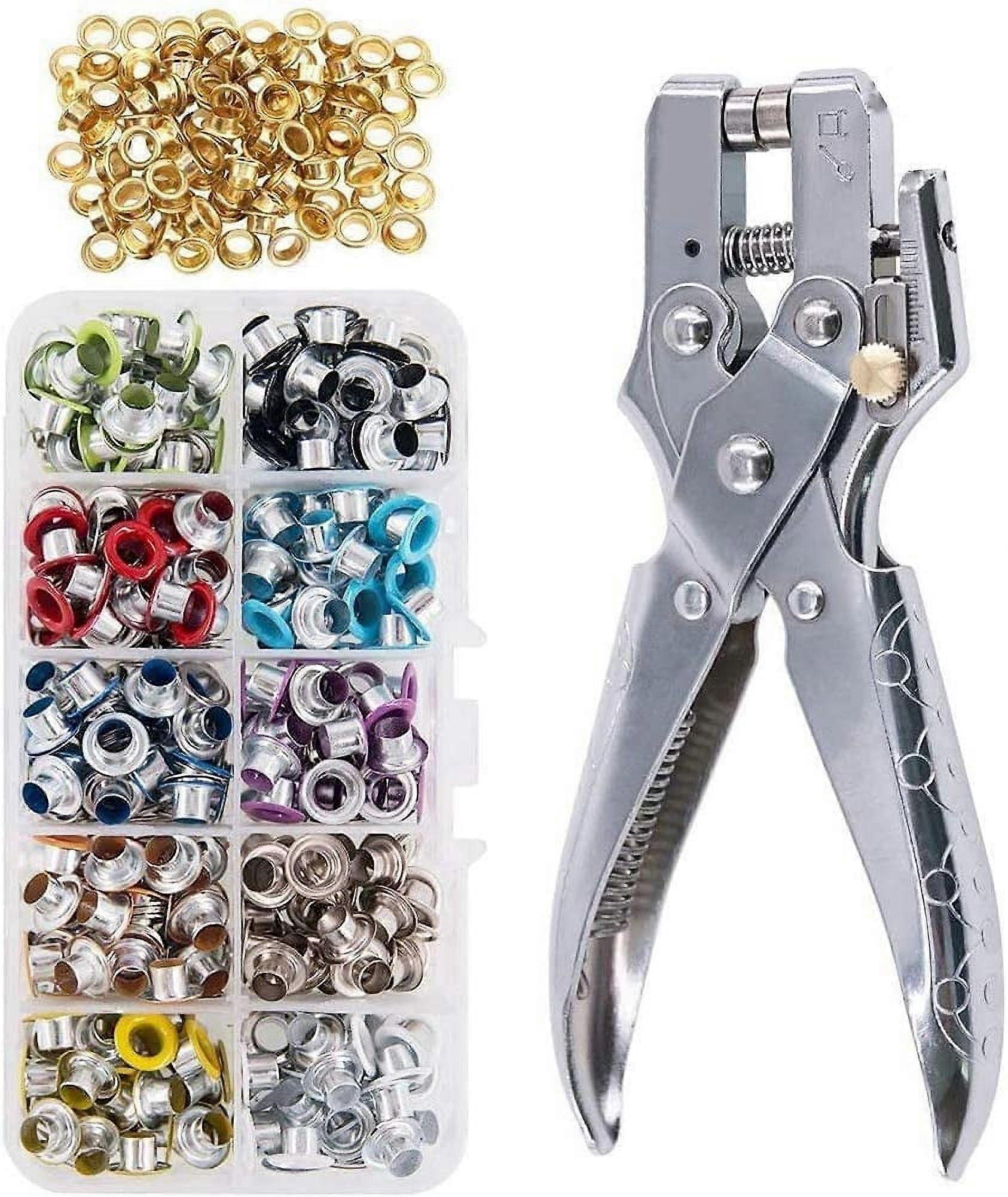 KONIBN 300 Sets Multi-Color Metal Eyelets Grommets Kit, including Hole Punch Plier and 100pcs Extra Gold Eyelets Specification: Types: 11 Colors Metal Eyelets Grommets Kit with Grommet Setting Tool Eyelets color: gold, red, blue, green, silver, yellow, purple, white, black, orange and navy blue. Metal grommets size: ▸Outsider diameter: approx.1/5 inch (5mm) ▸Insider diameter: approx. 2/5 inch (10mm) ▸Barrel length: approx. 1/5 inch (5mm) Each set of grommet includes 2 parts: an eyelet and a washer (Except the 100pcs gold eyelets) Package includes: 1pcs x Hole Punch Plier 300 sets grommets (10 colors x 30 sets) 100pcs x extra gold eyelets Hole Punching Step 1. Remove the metal fixing rod 2. Rotate the dial control knob to locate the appropriate position 3. Place the material to be punched in the punching area and aim the punching tool head at the punching position 4. Hold the handle and press hard to complete the hole punching Step of Grommet Installation 1. Remove the metal fixing rod 2. Select the appropriate metal grommet to place in the punched hole 3. Place the metal eyelet in the correct position and direction according to the tip on the front of the instrument 4. Hold the handle and press hard to complete the hole [High Quality Puncher] The hole punch plier made of heavy-duty carbon steel, with adjustable inset guide, die-cast zinc jaws, tool steel mandrel, dependable & strong. [Multi-Colors Metal Eyelets] 10 colors are Red, Blue, Green, Silver, Yellow, Purple, White, Black, Orange and Navy Blue, each color 30 sets, tatal 300pcs Metal Eyelets with Washers [Quality Grommets] The grommets are made of iron material, anti-tension, anti-moisture, anti-oxidation! All of them were painted with bright color, not easy to paint off! [Easy to Operate] The eyelet kit pliers are ergonomically designed for the human hand, with a spring action for ease of use to produce less hand strain [Ideal for Home Use] This metal eyelets grommets kit is useful for leather, tents, awnings, canvas, tarps and other cloth-made items. You can widely apply them into bags, shoes, clothing, shoelaces and other DIY crafts projects!