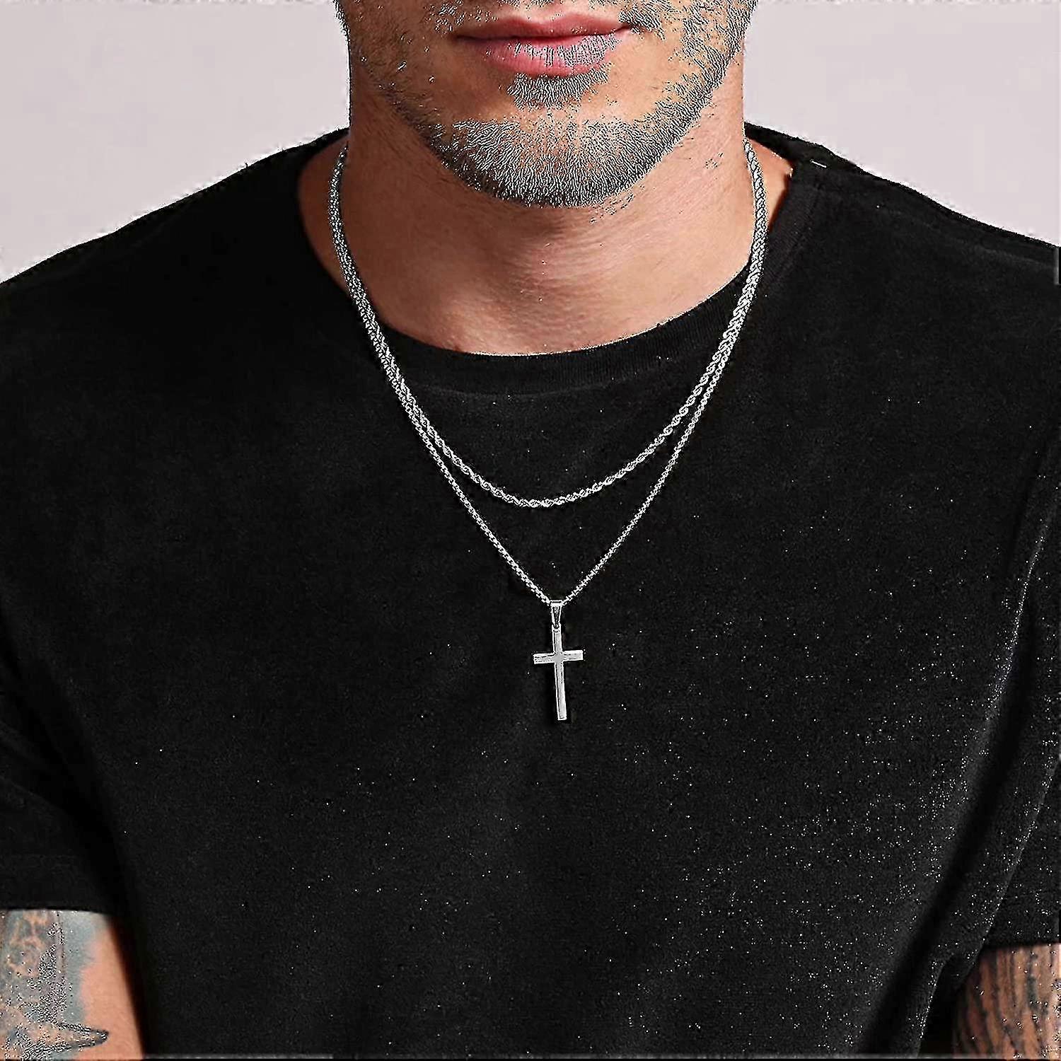 Men's Cross Necklace with Stainless Steel Rope Chain and Cross Pendant - Silver, Black, Gold Layered Design
