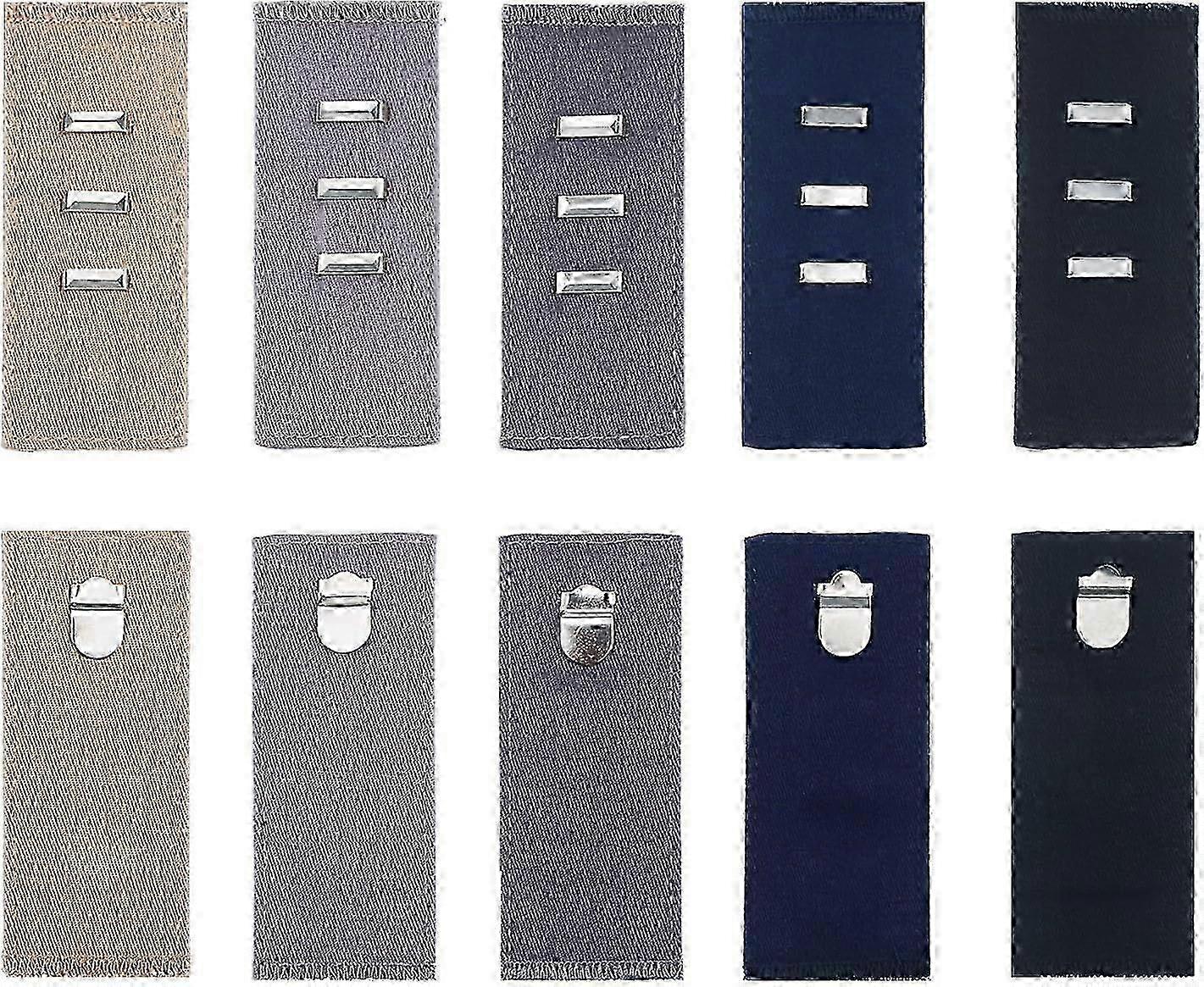 Quantity: 10 x pant extenders 5 Colors: dark blue, black, dark gray, grey and khaki, to match different colors of pants, jeans or trousers Appearance: metal hook style waist extenders, each with a metal hook on its back, and has 3 hook eyes on its front side Easy to attach or disassemble: simply put (take) the waist extenders' metal hook into (out of) the pants' hook eye, no sewing required Function: can add extra 1 or 2 - 2 inch width in your pants waistband for comfortable, useful hook extenders for adjust pants, jeans, trousers and skirts waist length Size (LW): 3.3 x 1.3 inch or 8.4 x 3.4 cm Invisible: use in pants of the same color as waist extender, it can be discreetly hidden behind your belt, Warm notice: to make the zipper of the trousers closed properly, it is recommended that the length of the extended waistband no more than 1 inch