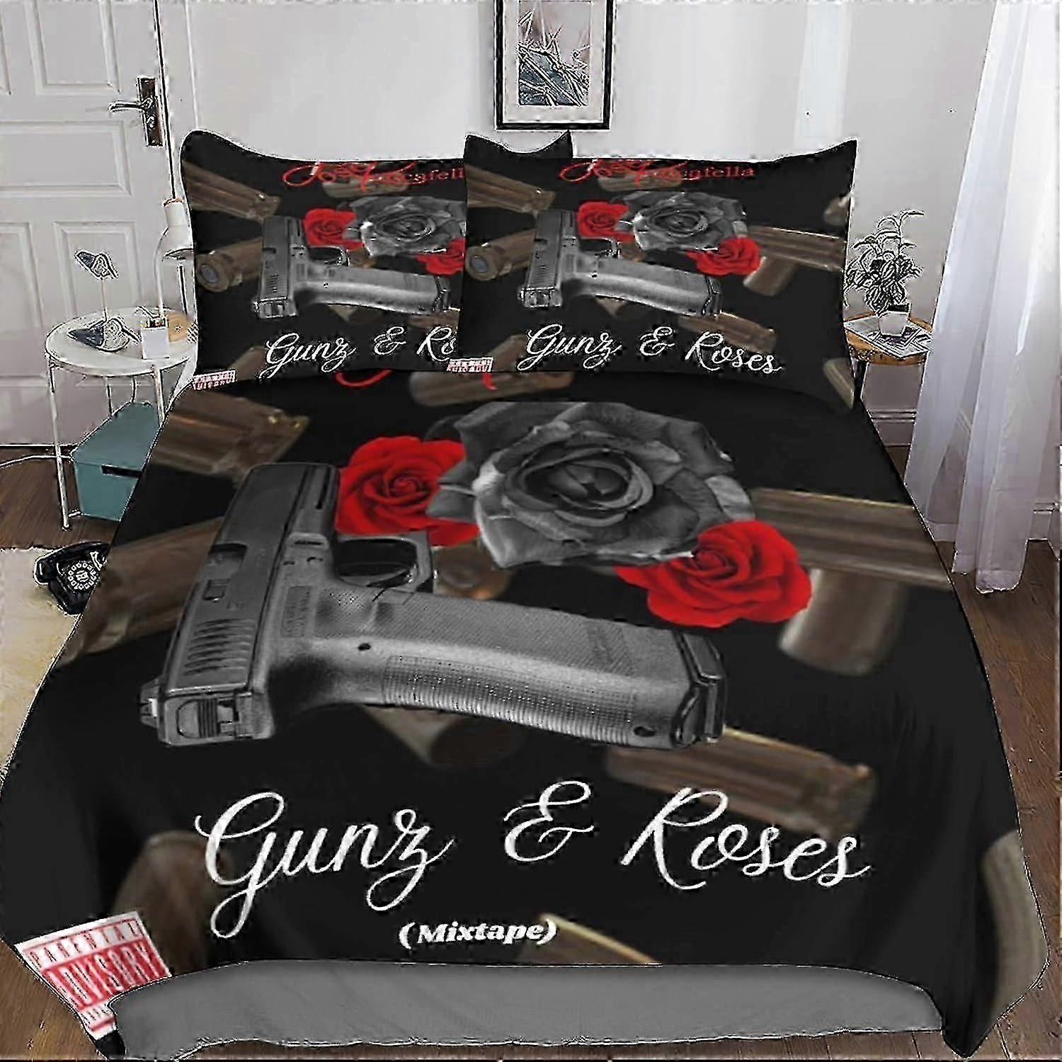 Gun And Rose 3 Piece Bedding Set With 3d Skull Duvet Cover - Microfiber Bedding Set With Zipper Closure Cs