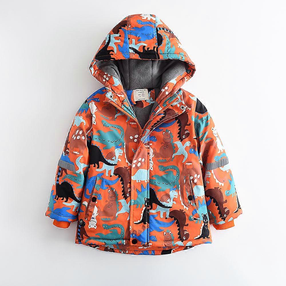 2025 Winter Weatherproof Boys Dinosaur Print Plush Thick Hooded Cotton Jacket