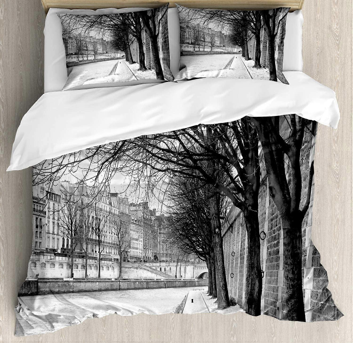 Black and White Duvet Cover Set, Seine River Paris France Snowy Winter City Trees, 1 Duvet Cover & 2 Pillowcases, Dimgray