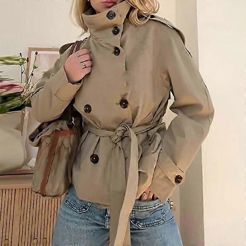 Solid Color Double Breasted Belted Waist Short Trench Coat Slim Fit Design