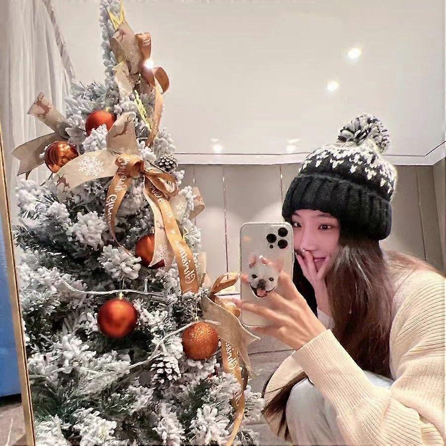 Warm Knitted Beanie Windproof Wool Hat with Pom Pom for Large Head Slimming Face Christmas Cap