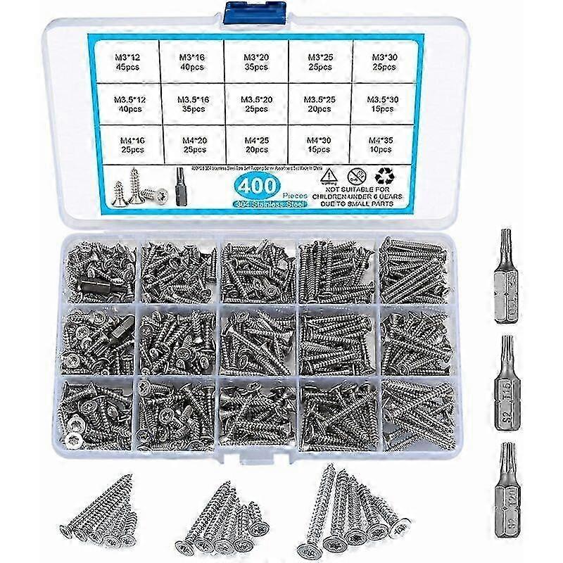 400 Pices Vis Autotaraudeuses, Vis Tte Fraise Acier Inoxydable, Vis Autoperceuses Tte Torx, Vis Bois Cloison Sche avec Forets-M3/M3,5/M4, 12