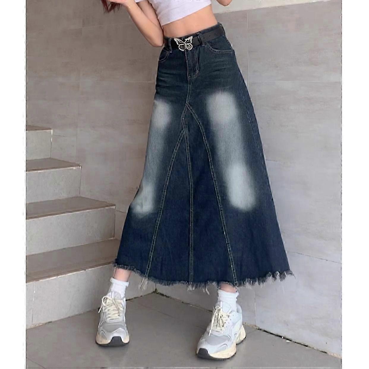 Design-Sensing White Spliced Draped Denim Mid-Length Skirt For Women Loose Slim A-Line Fishtail Skirt Umbrella Skirt 25-26