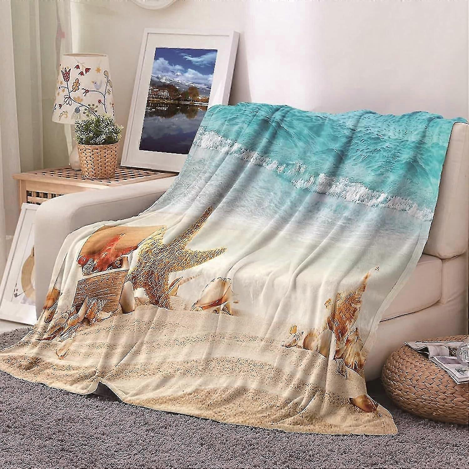 Blanket Flannel Blanket Soft,couch Blankets Beach Pattern With Shells And Starfish Khaki Blue Big Blankets 160x200cm