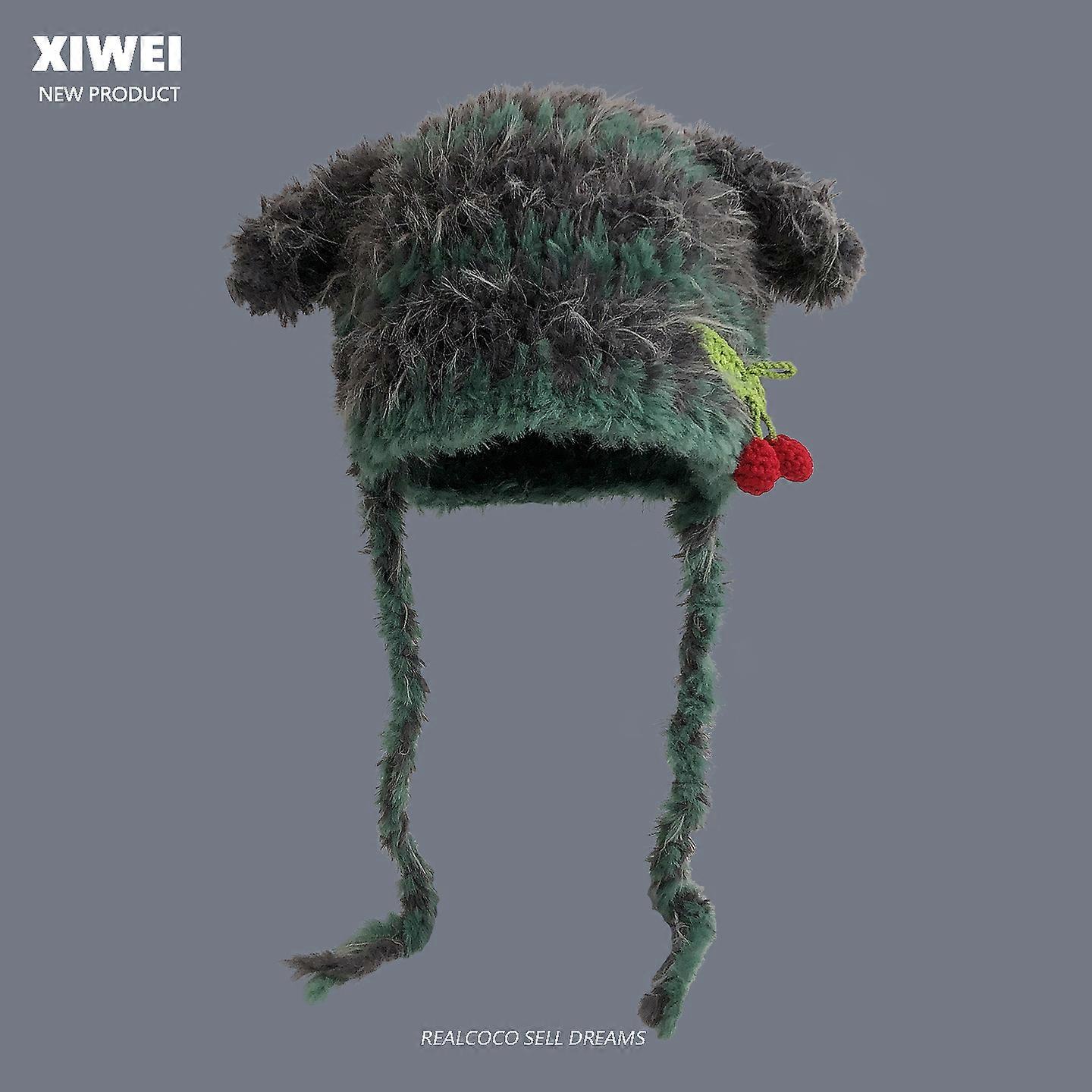Harajuku Contrasting Color Striped Plush Wool Hat Women Autumn Winter Warm Versatile Cherry Braid Knitted Ear Beanie Cap