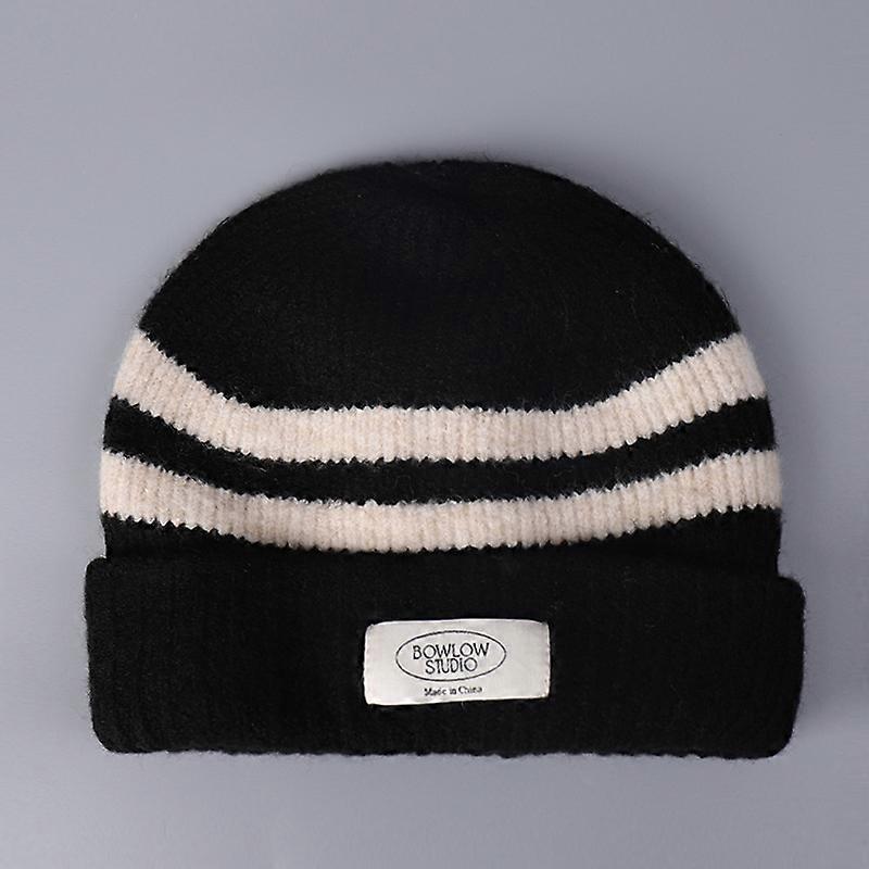 Soft Chewy Double-Layer Woolen Striped Knitted Beanie Cap Women Winter Casual Outdoor Sports Rolled Edge Cold-Proof Cold Hat