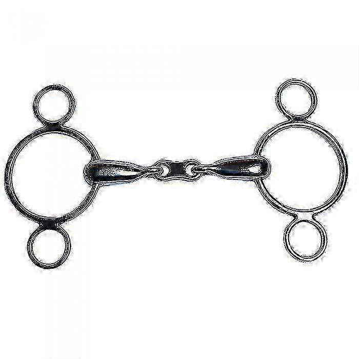 The French Link Two Ring Dutch Gag is milder on the horses mouth than a single-jointed gag, due to the central link reducing the nutcracker action on the tongue and roof of the mouth. The French Link Two Ring Dutch Gag bits main action is on the horses poll, the roof of the mouth and on the bars of the mouth. The amount of poll pressure can be increased by attaching the rein to the bottom ring, therefore making the bit stronger and more severe. The Two Ring Dutch Gag can be used with one rein, two reins or with roundings. If a small amount of chin pressure is required, curb hooks can be attached to the top ring to use a curb chain, or a leather strap can be looped through the top rings and under the chin. This bit is not dressage legal.
