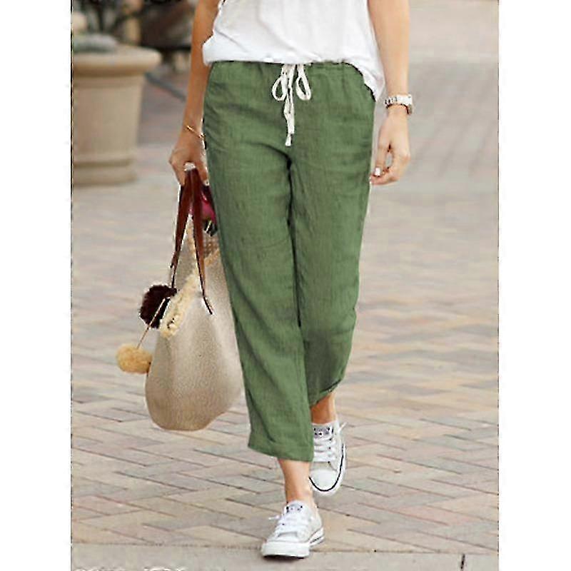 25-26 New Solid Color Loose Casual Elastic Waist Cotton Linen Capri Pants For Women Slim Fit Drawstring Capri Trousers Pockets Pants