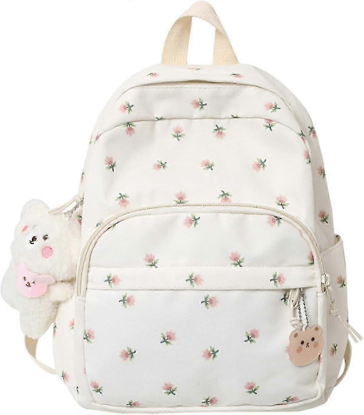 25-26 Cute Preppy Backpack with Pendant Mini Floral Printed Backpack Cottagecore Coquette Aesthetic Bag Kawaii Laptop Backpack (One Size,White)