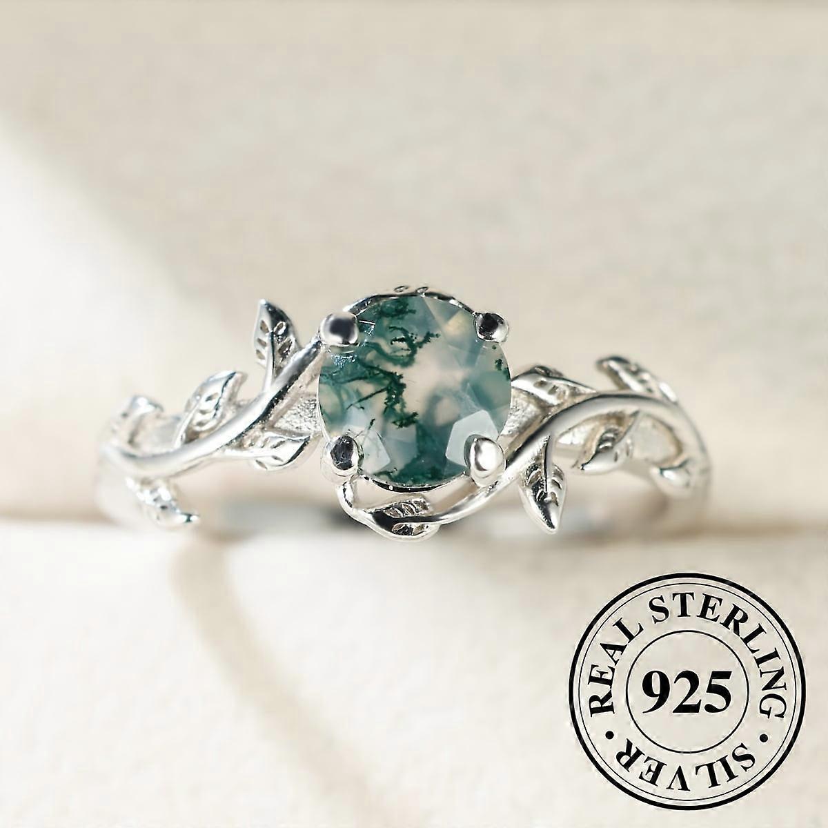 925 Sterling Silver Delicate Leaf Band Ring Green round Agate Niche Unique Wedding Ring