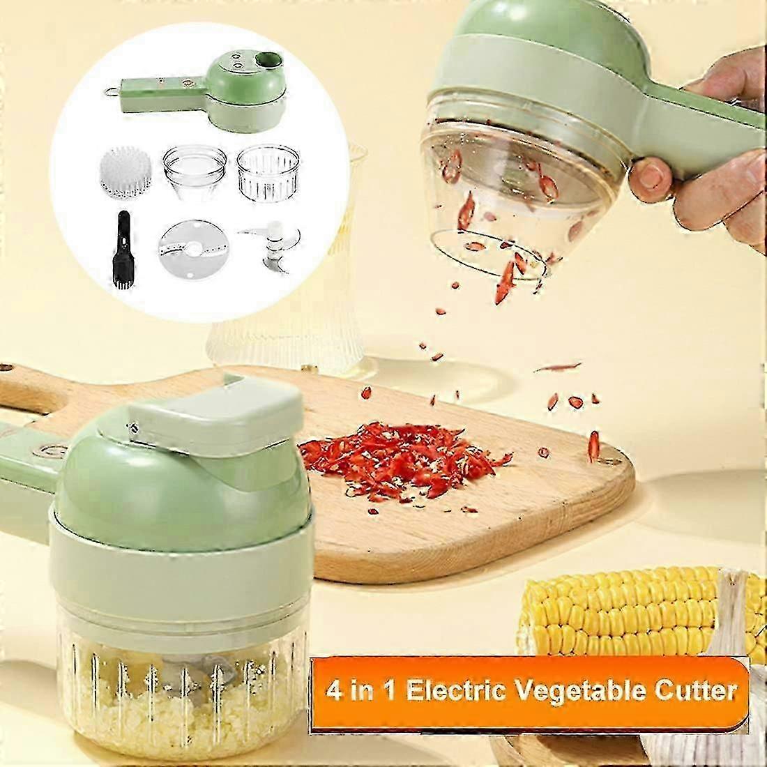 {4 in 1 Multifunctional Electric Vegetable Cutter Set}: Handheld Multifunctional Electric Vegetable Cutter Set includes slicing, cooking, peeling and cleaning brush 4 in 1 functions. With it, you can have an electric vegetable slicer and an electric meat grinder at the same time. One machine is multi-purpose, convenient and fast.{One-key cleaning} The whole machine is rinsed, and the detergent is added to the inlet to start with one key, and it can be cleaned by stirring with running water for 5 seconds.{Easy to use}: Made of high-quality ABS+PP+PC+stainless steel, light and durable. Stainless steel blades and serrated edges make ingredients more delicate. Let you eat healthy and rest assured.{Perfect Design}: The ergonomic, comfortable grip is stable and won't loosen, and the blade is flexible enough to easily cut, slice, and cut fruits and vegetables shapes and sizes in the shortest possible time. It's the perfect tool to make home cooking easier and faster.{Filling the hole}: It is also very convenient to add one, eliminating the tedious steps of opening and twisting the lid, and long strips of ingredients such as peppers, cowpeas, and yam can be inserted directly. Note: Due to the light and screen setting difference, the item's color may be slightly different from the pictures. Please allow slight dimension difference due to different manual measurement.