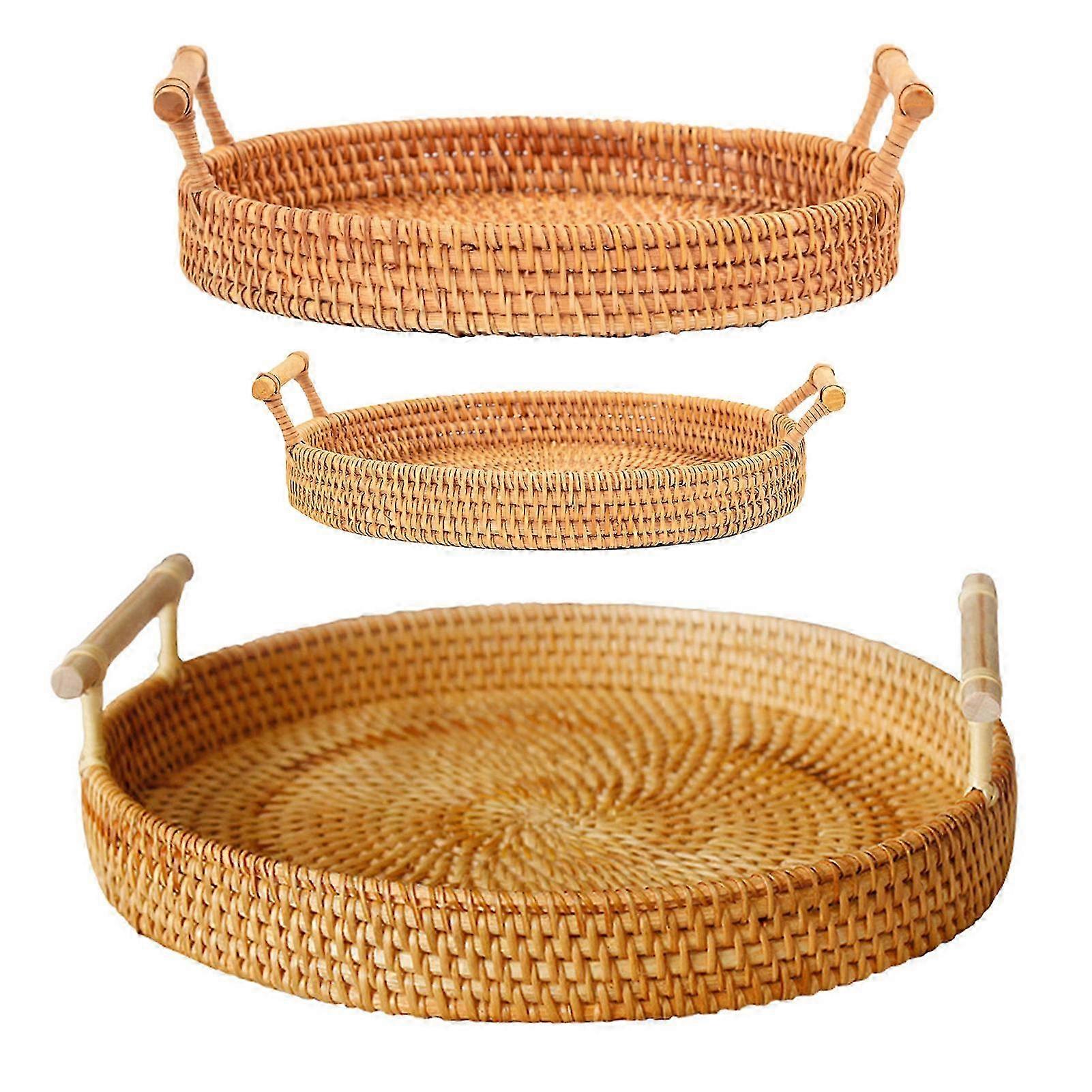 25-26 Hand Woven Round Rattan Serving Tray Bread Fruit Dessert Snack Basket with Handles 3 Piece Set