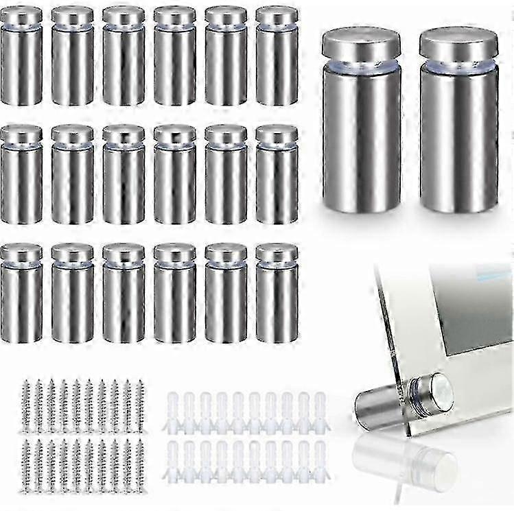 : Glass spacer, brushed nickel, helps prevent rust, scratches and corrosion, ensuring quality and longevity. Design: Simple design, no frame required. Notice boards can be fixed with screws. Wide range of uses: Advertising nails are suitable for indoor or outdoor use, such as businesses, offices, supermarkets, hotels, stores and billboards.Product Specifications:Color:SilverMaterial: stainless steel, brushed nickel for surface treatmentSize: 12 x 25 mmHow to install:1. Drill holes on your panel and make sure the hole size is correct.2. Mark the holes for your sign on the wall, make sure the sign will install in the correct place.3. Drive the anchor screw to the wall.4. Install the barrel on the wall.5. Put on the sign or glass and thread the stud to the bar.Package Include:20pcs Glass Standoffs20pcs Rubber StandoffsExpansion Particle Installation Accessories Color Random Note1.Due to the difference between different monitors, the picture may not reflect the actual color of the product.2.Due to the manual measurement, please allow a slight deviation of 1-2mm. Note: The data is all measured manually, please allow 1-3cm error, due to the difference in light and display, there will be a certain color difference, the actual object received shall prevail. Note: Due to the light and screen setting difference, the item's color may be slightly different from the pictures. Please allow slight dimension difference due to different manual measurement.