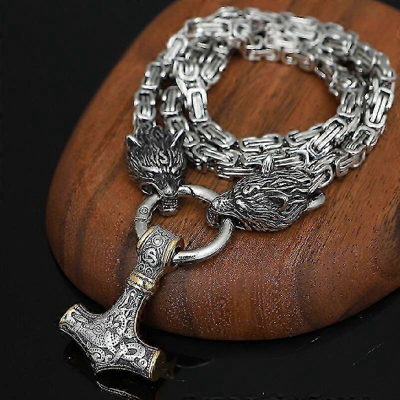 25-26 Stainless Steel Wolf head Necklaces Men Norse 's Hammer Mjolnir Pendant Scandinavian King Chain Viking Jewelry