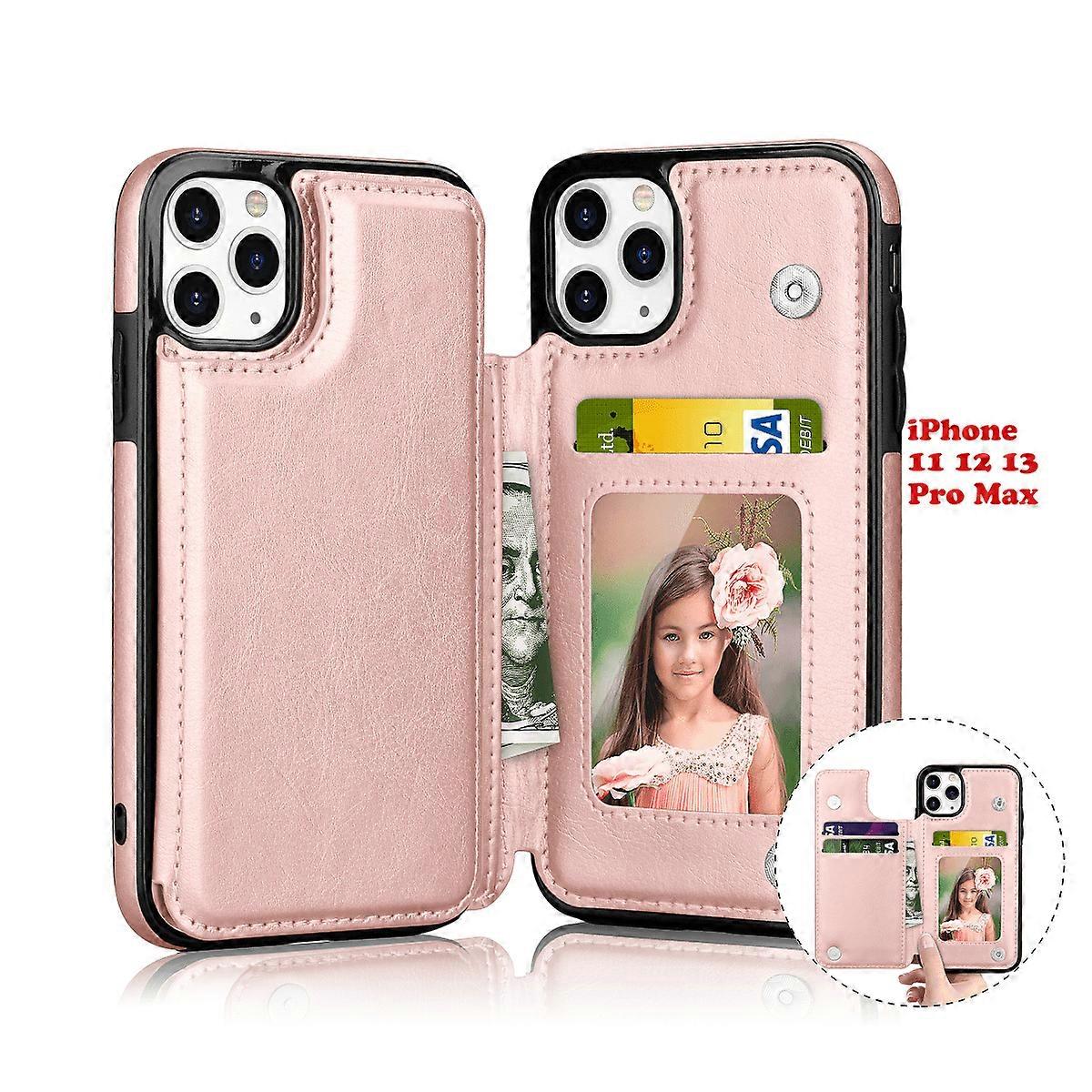 Wallet Case with Card Holder compatible with iPhone 11 12 13 Pro Max, Premium PU Leather Kickstand, Double Magnetic Clasp, Shockproof Cover - Rose